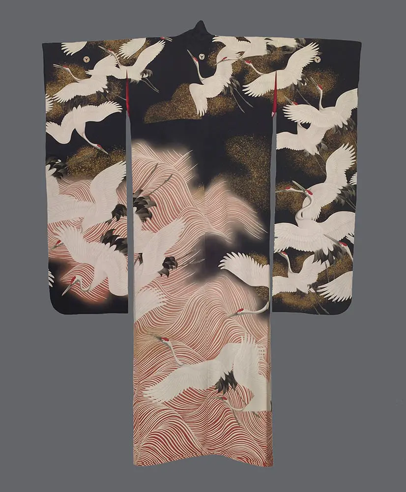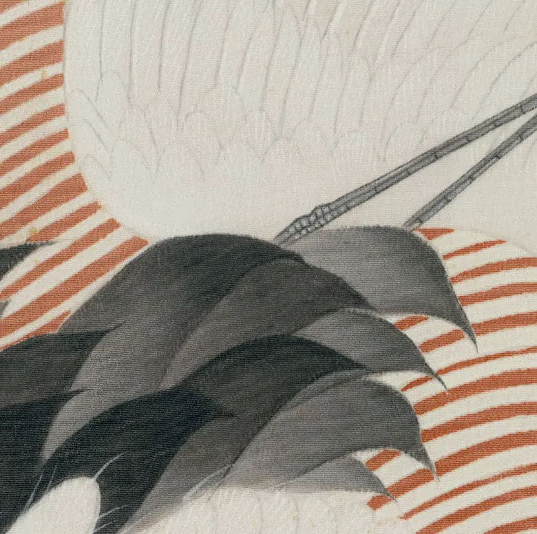 The artistic treatment reveals the influence of both traditional Rinpa school aesthetics and emerging modern sensibilities of the early 20th century. The flowing, undulating wave patterns that dominate the lower portion of the garment demonstrate the sophisticated use of negative space and rhythmic linear design that characterizes Japanese decorative arts. These stylized waves, rendered in coral and orange gradations, create a sense of perpetual motion that complements the soaring cranes above. The juxtaposition of the earthbound wave motifs with the airborne cranes creates a harmonious balance between different elements of nature.