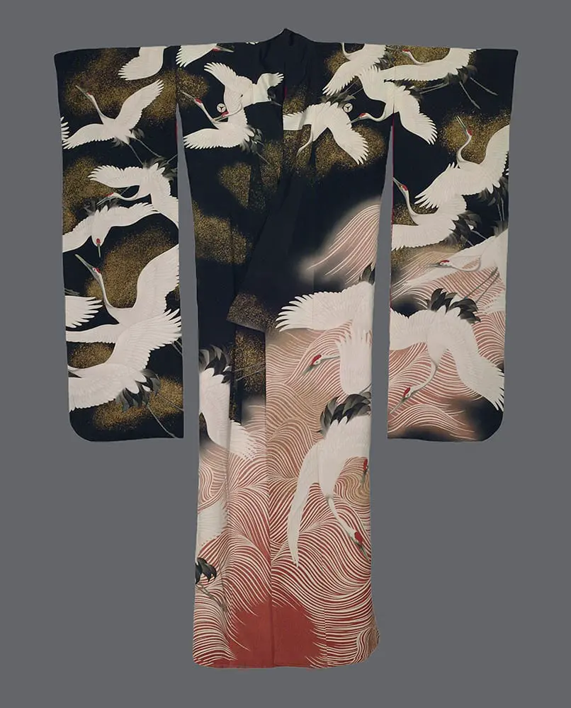 This magnificent kurofurisode showcases a dramatic and dynamic composition of flying cranes rendered in the yuzen dyeing technique, enhanced with delicate sagara and simple embroidery highlights that add dimensional texture to the birds' forms. The design exemplifies the classical Japanese aesthetic principle of capturing movement and vitality, with the cranes depicted in various stages of flight across the black silk ground.