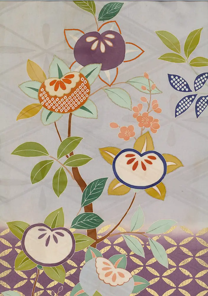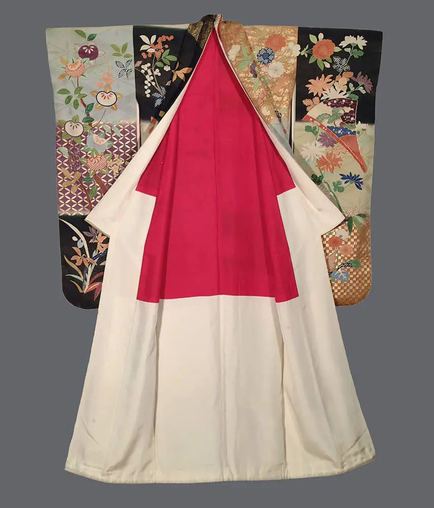 This extraordinary rinzu silk furisode represents a pinnacle of Japanese textile artistry. The large-scale quadrated background creates a dramatic checkerboard effect that immediately evokes the theatrical traditions of Edo period Noh costumes, where such geometric divisions served both aesthetic and symbolic functions. This architectural approach to surface design reflects the influence of contemporary movements toward geometric abstraction, while maintaining deep roots in classical Japanese stage costume traditions.