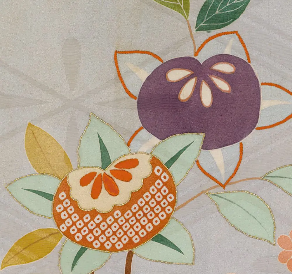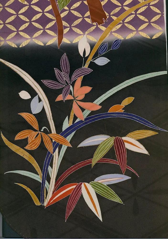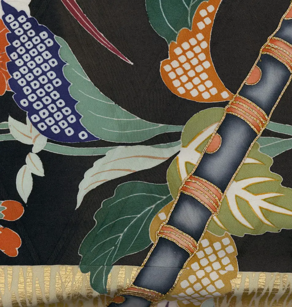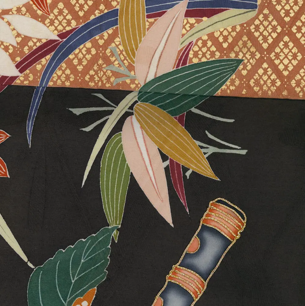 The yuzen-painting technique is employed with exceptional virtuosity across this complex surface, with each quadrant receiving distinct motifs that range from naturalistic botanical elements to stylized seasonal symbols. The detail images reveal the masterful execution of traditional Japanese decorative vocabulary: bamboo segments rendered with precise linear detail, autumn leaves in graduated color washes, and flowering branches that demonstrate the yuzen painter's ability to achieve both bold graphic impact and delicate naturalistic effects. The metallic couching and gold foil applications create luminous accents that would have shimmered dramatically under stage lighting, while the satin-stitch embroidery adds textural richness and dimensional quality to key motifs.