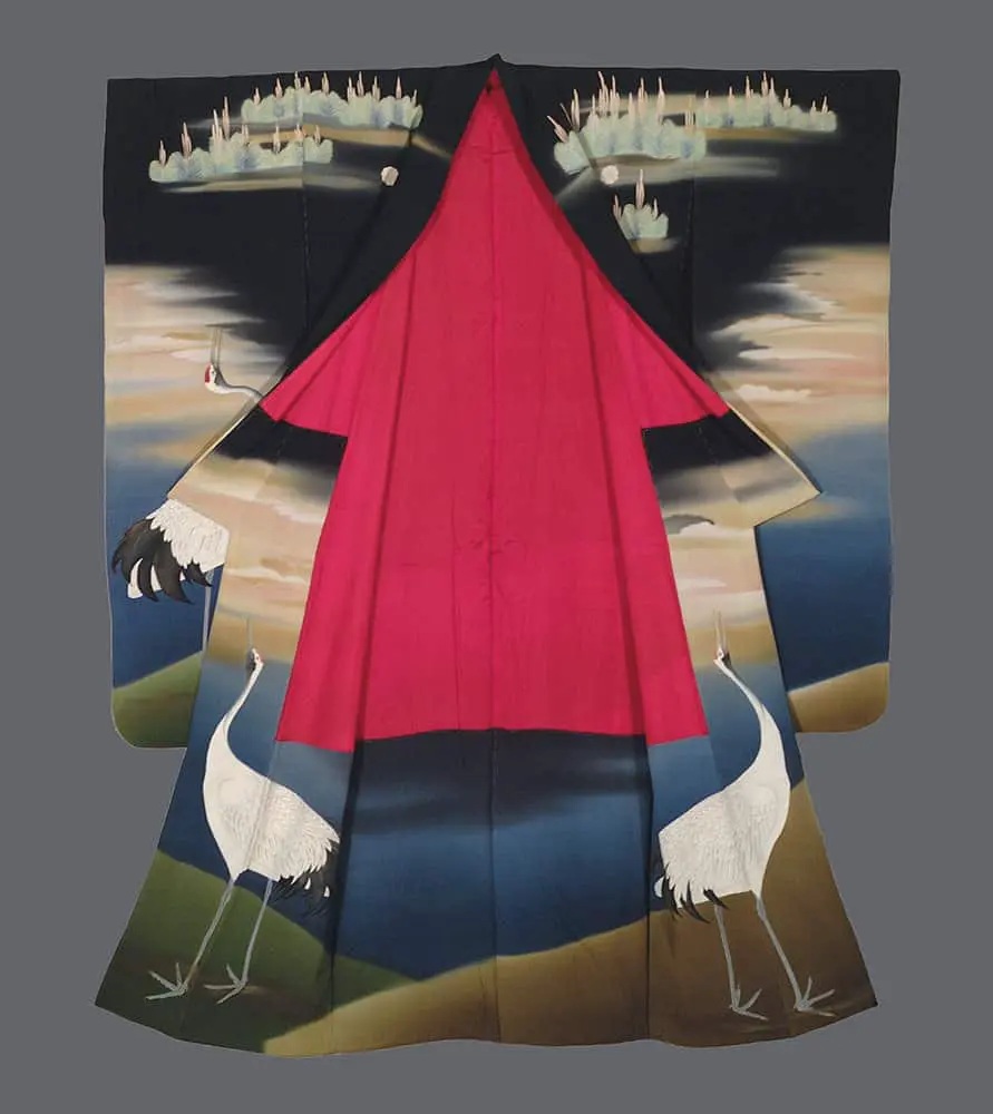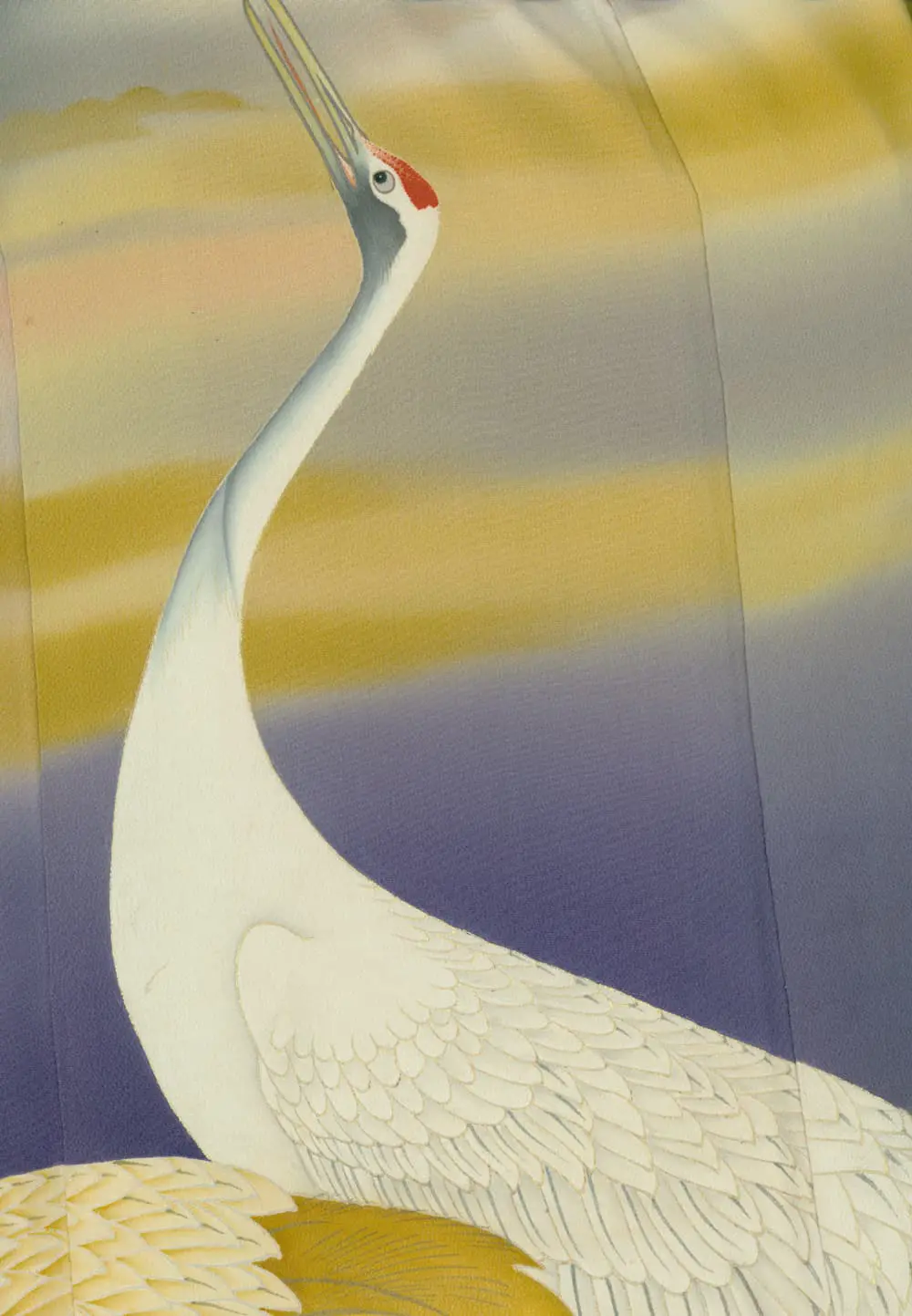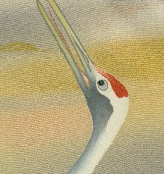 The artistic treatment reveals the period's mastery of spatial composition, where each crane is given individual character through subtle variations in posture and expression, yet all contribute to a unified narrative of grace and transcendence. The yuzen painting is enhanced by both simple and sagara embroidery techniques that add dimensional texture to the birds' plumage and the atmospheric background. This outer garment would have created a dramatic silhouette when worn, with glimpses of the red and white layers visible at the neckline and sleeves, embodying the Japanese aesthetic principle that true luxury lies not in ostentation but in the sophisticated interplay of revealed and concealed beauty—a concept that connected Taisho-era brides to a millennium of aristocratic tradition.