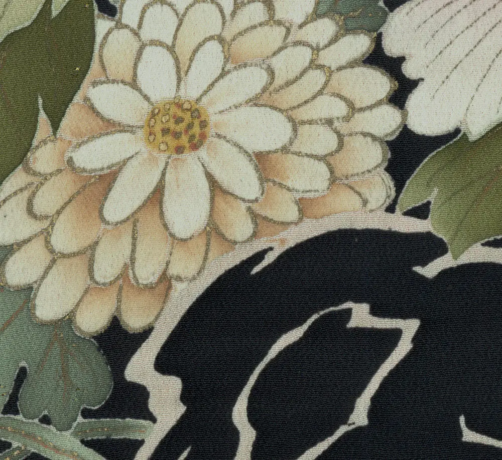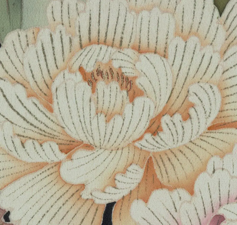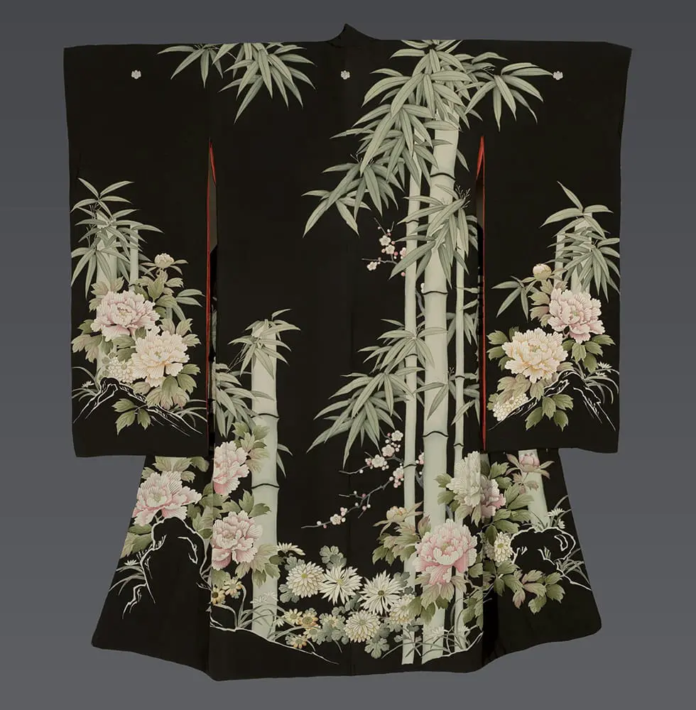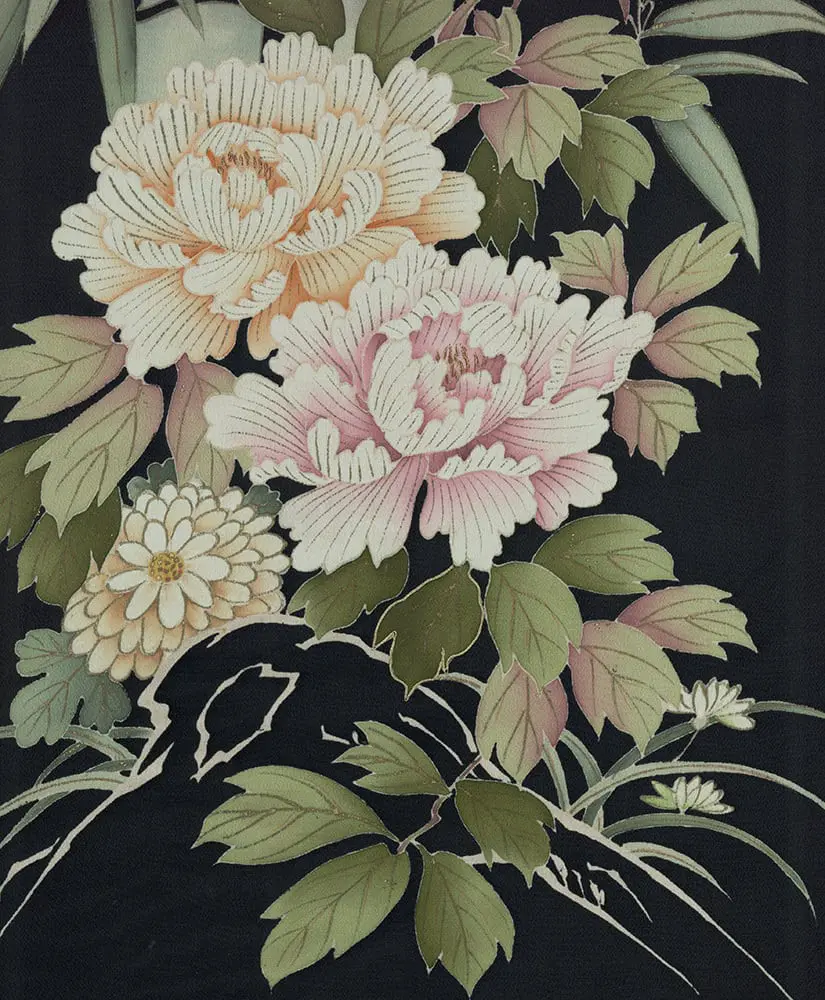 This chirimen silk kurofurisode features a striking composition of bamboo stalks, peonies, and plum blossoms against a dramatic black ground, executed in the yuzen painting technique and enhanced with embroidery, couching, and metallic foil outlining. The bamboo, rendered in naturalistic pale green tones, symbolizes resilience, longevity, and moral integrity in Japanese culture, while the abundant peonies—depicted in soft pink and coral hues—represent honor, wealth, and feminine beauty, making them particularly appropriate for a wedding garment. The delicate plum blossoms, with their association with perseverance through adversity and the promise of spring, add layers of auspicious meaning to this bridal ensemble.