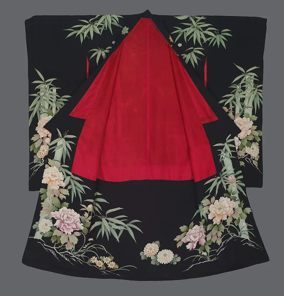 Adorned with five family crests, it stands as the most formal of kimonos, measuring 52 inches (132 cm) from sleeve-end to sleeve-end and standing at 59 inches (150 cm) in height.