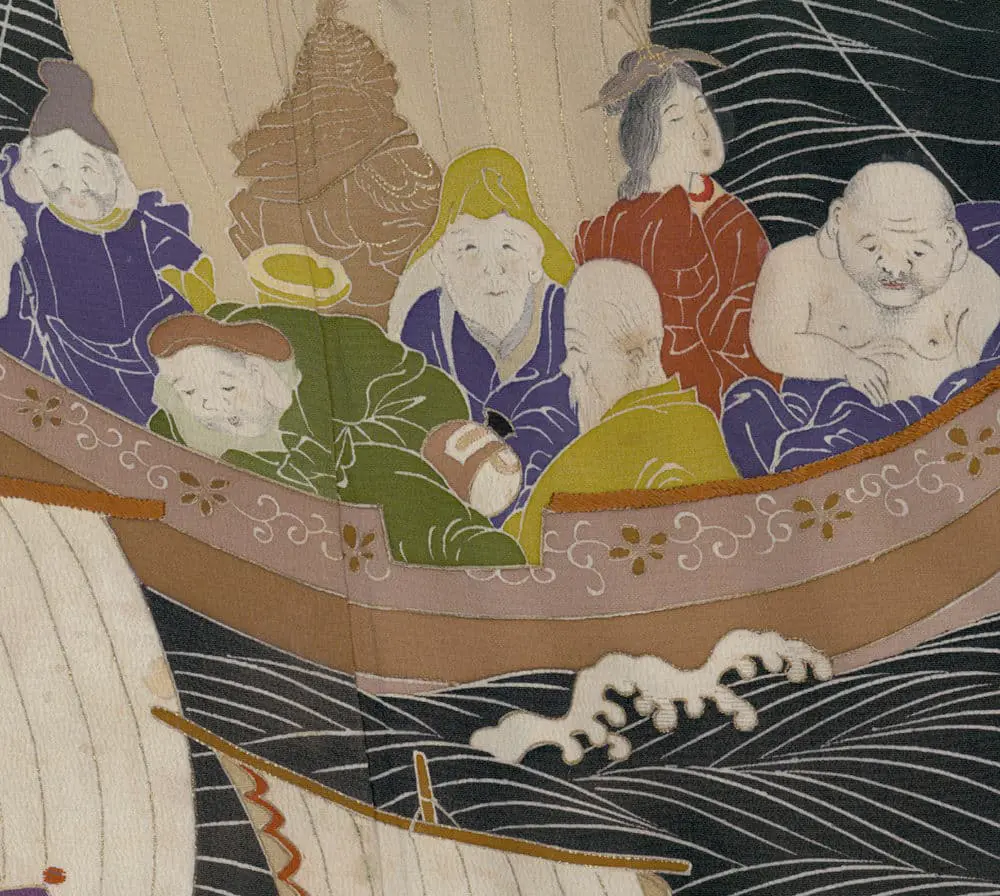 Symbolically, this kimono functions as a concentrated repository of good fortune imagery. The treasure ships traditionally appear in Japanese New Year celebrations, believed to bring prosperity and luck for the coming year. The inclusion of the Seven Gods of Good Luck (Shichifukujin) aboard one vessel, while the remaining twenty-three ships overflow with their associated treasures—including precious scrolls, coral branches, and various ritual objects—transforms the garment into a wearable mandala of auspicious symbols. The coral and marine motifs visible in the detail shots further reinforce themes of abundance from the sea, while the careful arrangement of figures within each boat suggests narrative scenes of celebration and divine blessing. This extraordinary concentration of fortune-bringing imagery, combined with the garment's exceptional craftsmanship, strongly supports its likely use in significant New Year performance contexts where maximum auspicious impact would be desired.