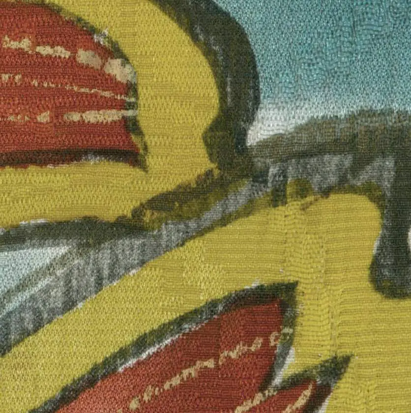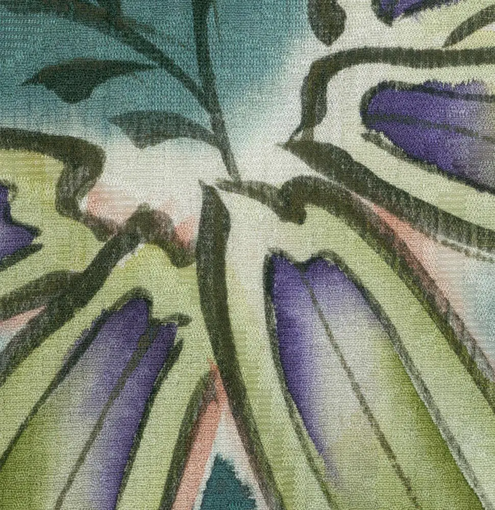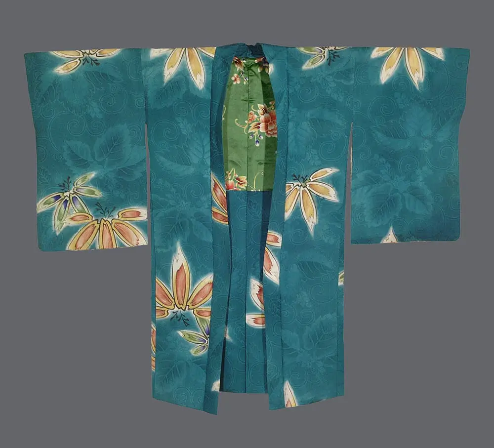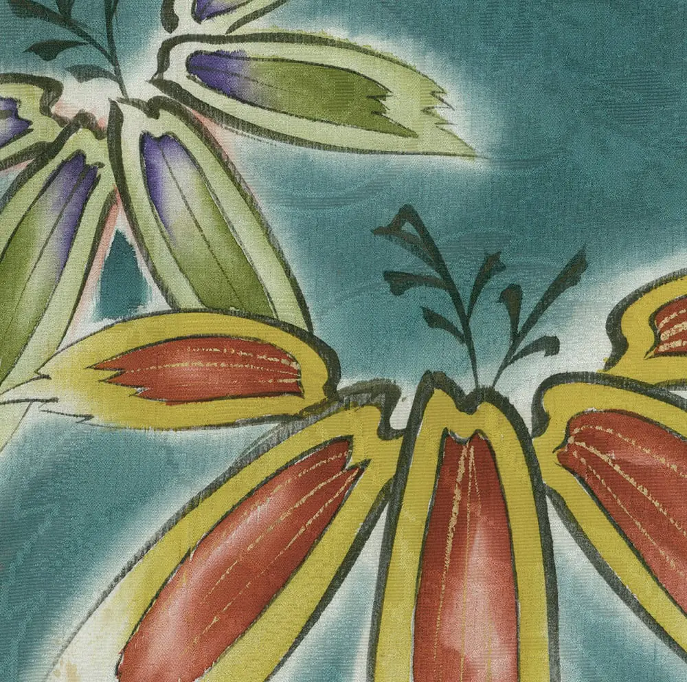 Bamboo grass motifs appear as the main pattern against a rinzu background of paulownia and tendrils. The bamboo grass emerges with bold, sweeping lines in shades of yellow, orange, and white, creating a sense of movement and energy against the turquoise background. The background pattern adds a layer of textural complexity and visual interest. The color palette is vibrant yet harmonious, with the warm tones of the bamboo grass contrasting beautifully with the cool teal. The artistic style of this haori demonstrates a blend of traditional Japanese aesthetics and those of Western art movements. The bold, simplified forms of the bamboo grass, along with the asymmetry and dynamism of the composition, are characteristic of Japanese design principles. The self-figured background pattern is also a common feature in Japanese textiles, adding a subtle elegance and refinement. However, the scale and boldness of the bamboo grass motif also suggest an affinity with Art Nouveau. The organic, flowing lines and the emphasis on decorative stylization are reminiscent of this Western movement, which often drew inspiration from natural forms. It's important to remember that Japanese art significantly influenced Art Nouveau, so this affinity is are flection of a cross-cultural exchange.