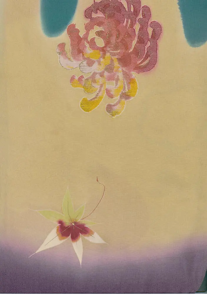 The arrangement of the floral elements, particularly the chrysanthemums, demonstrates the Japanese aesthetic principle of asymmetrical balance, while their stylized rendering shows sophistication in the yuzen technique. The addition of foil highlights adds a luxurious, luminous quality to the design, creating subtle plays of light that enhance the piece's visual depth.