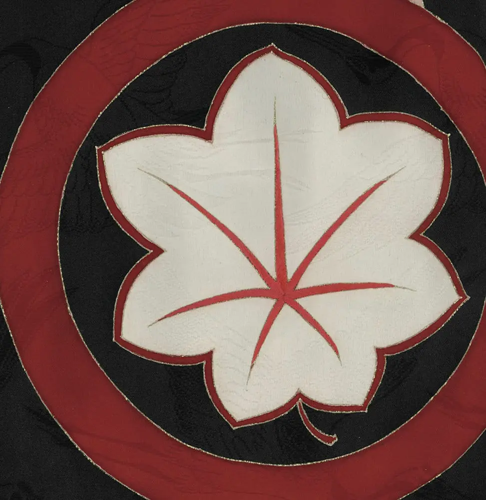 While the haori's design is firmly grounded in Japanese tradition, the vertical wavy lines and the overall dynamism of the composition suggest an affinity with the Art Deco movement. The simplified, almost geometric rendering of the wavy lines and the strong contrast between the black background and the colorful mon resonate with the Art Deco emphasis on streamlined forms and bold color palettes. However, the haori maintains a distinctly Japanese sensibility, reflecting the enduring influence of traditional motifs and techniques.