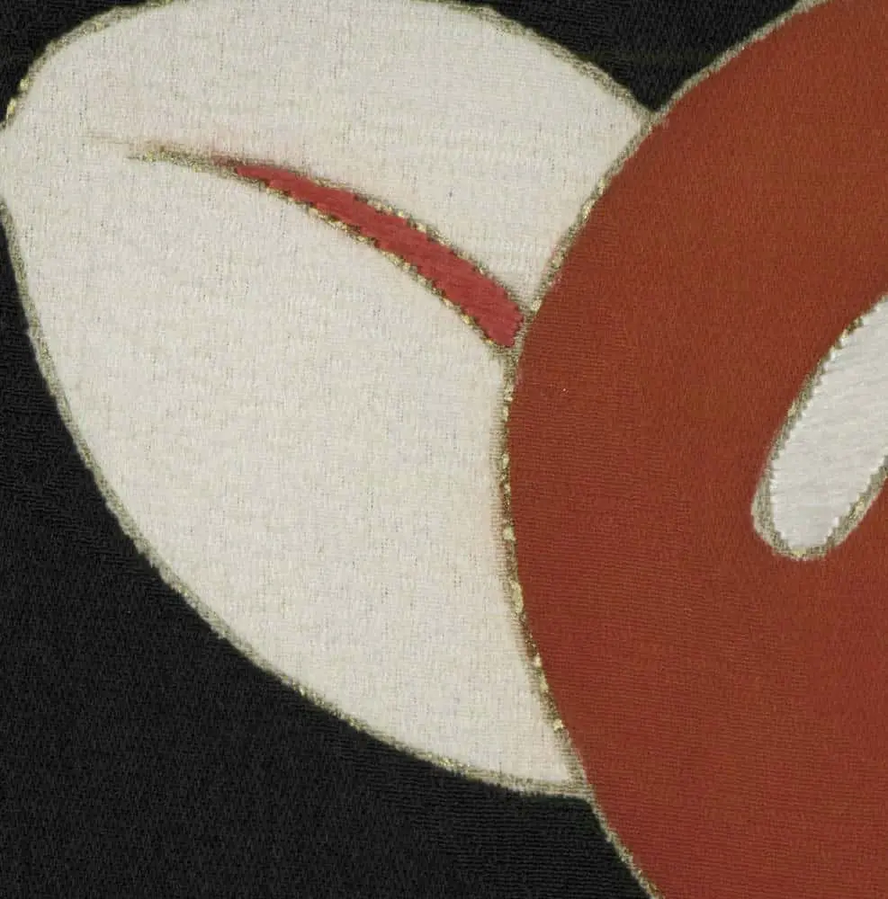 This haori showcases a sophisticated design that combines decorative mon and a rinzu crane pattern on the garment's base. The mon are rendered as circular motifs containing various floral and geometric designs, executed with remarkable precision and detail using yuzen painting, silk embroidery, gold foil, and embroidery. The colors are rich and harmonious, featuring shades of red, cream, and gold against a deep black background. The stylized, almost abstract, wavy lines are speckled, and provide a dynamic counterpoint to the static mon, adding a sense of movement and energy to the composition.