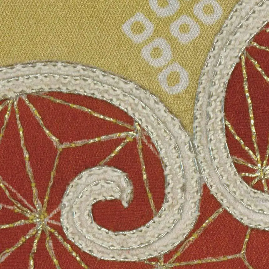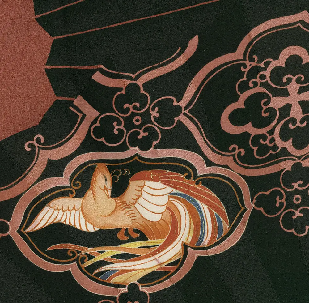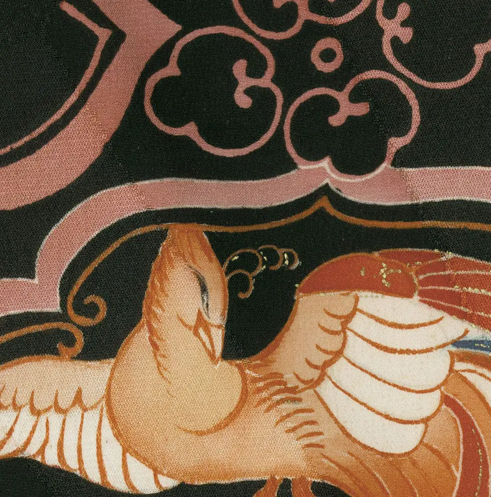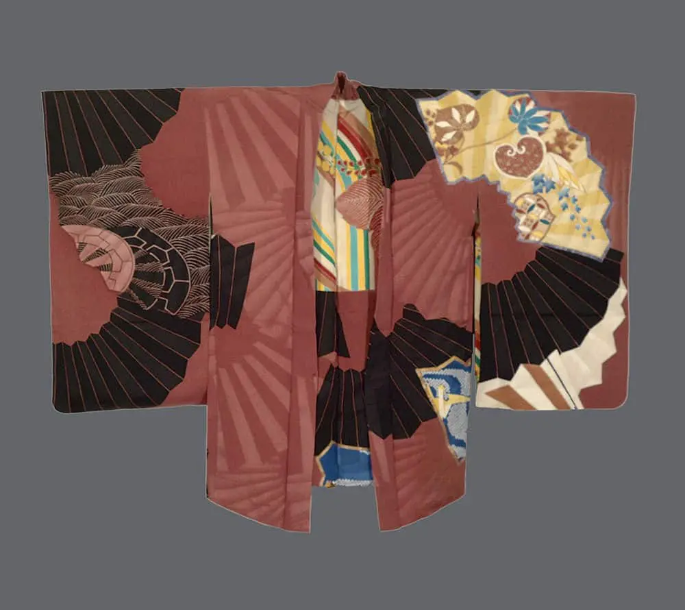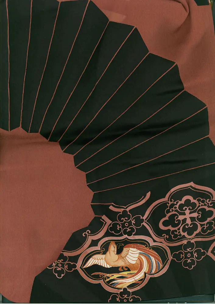 This haori features a striking yuzen-painted and metallic couched design. The large fan designs, rendered in rich blacks, cream, and contrasting shades of red, are reminiscent of the clean lines and stylized forms typical of Art Deco. These fan motifs are complemented by hollyhock, kaioke (shell containers), seashells, paper cranes, and phoenix motifs, with a single mon adding to its traditional significance.