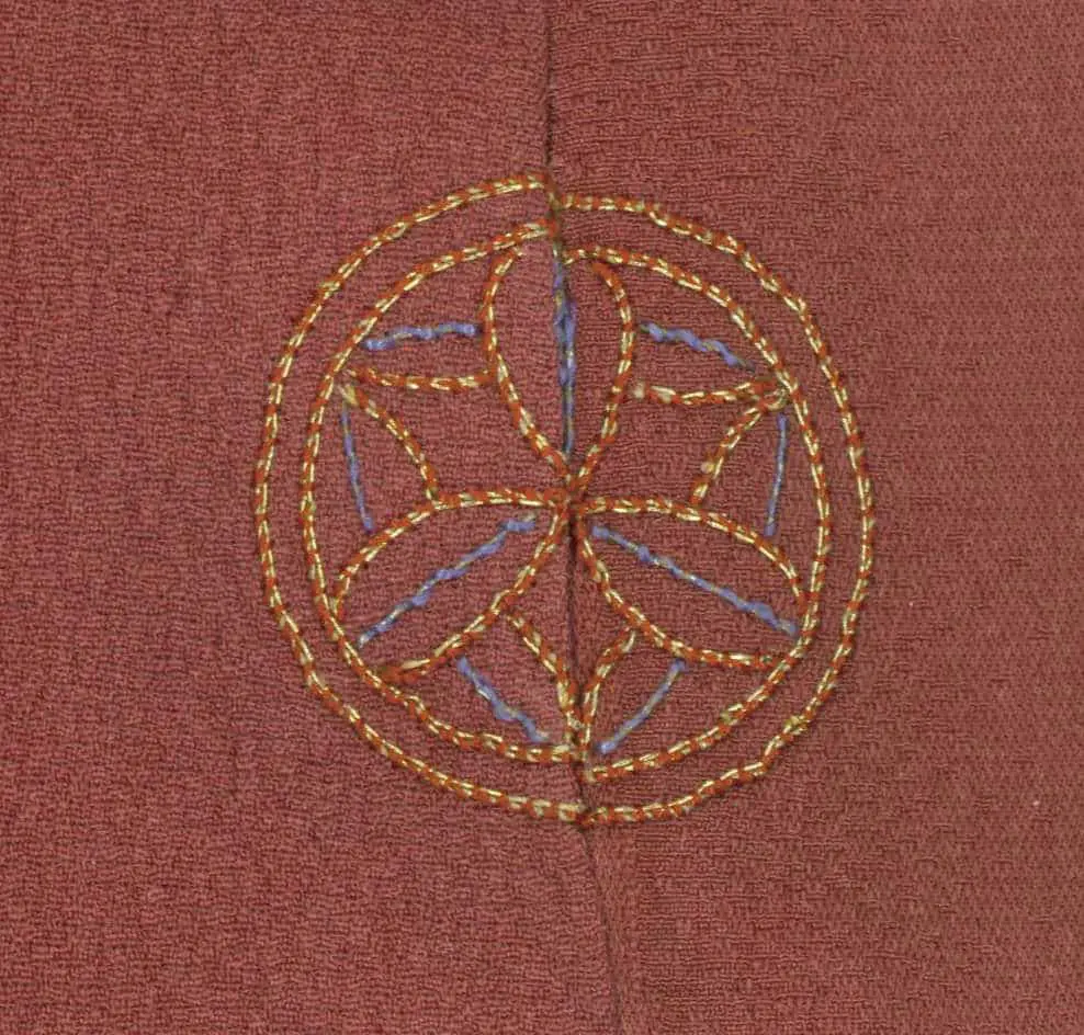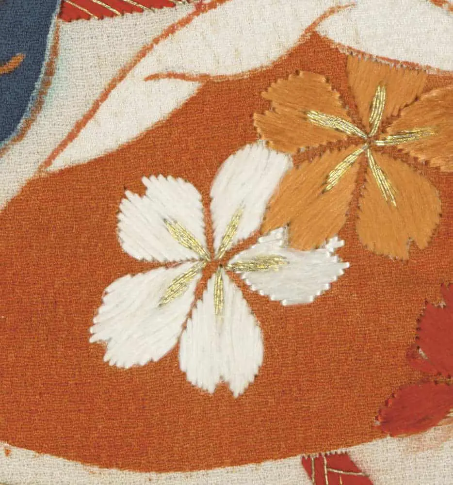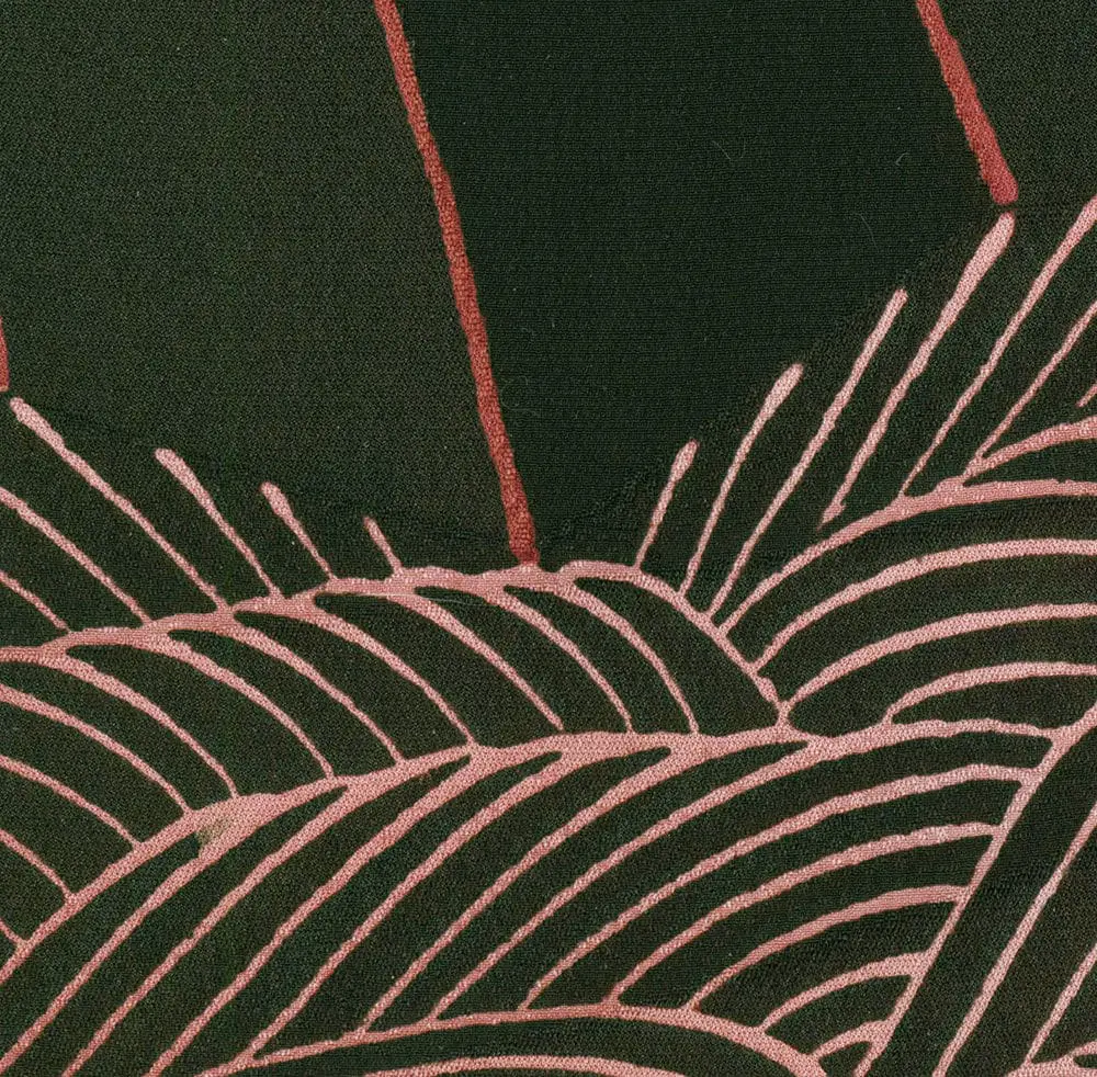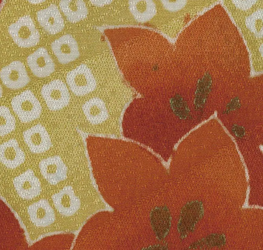 This haori features a striking yuzen-painted and metallic couched design. The large fan designs, rendered in rich blacks, cream, and contrasting shades of red, are reminiscent of the clean lines and stylized forms typical of Art Deco. These fan motifs are complemented by hollyhock, kaioke (shell containers), seashells, paper cranes, and phoenix motifs, with a single mon adding to its traditional significance.