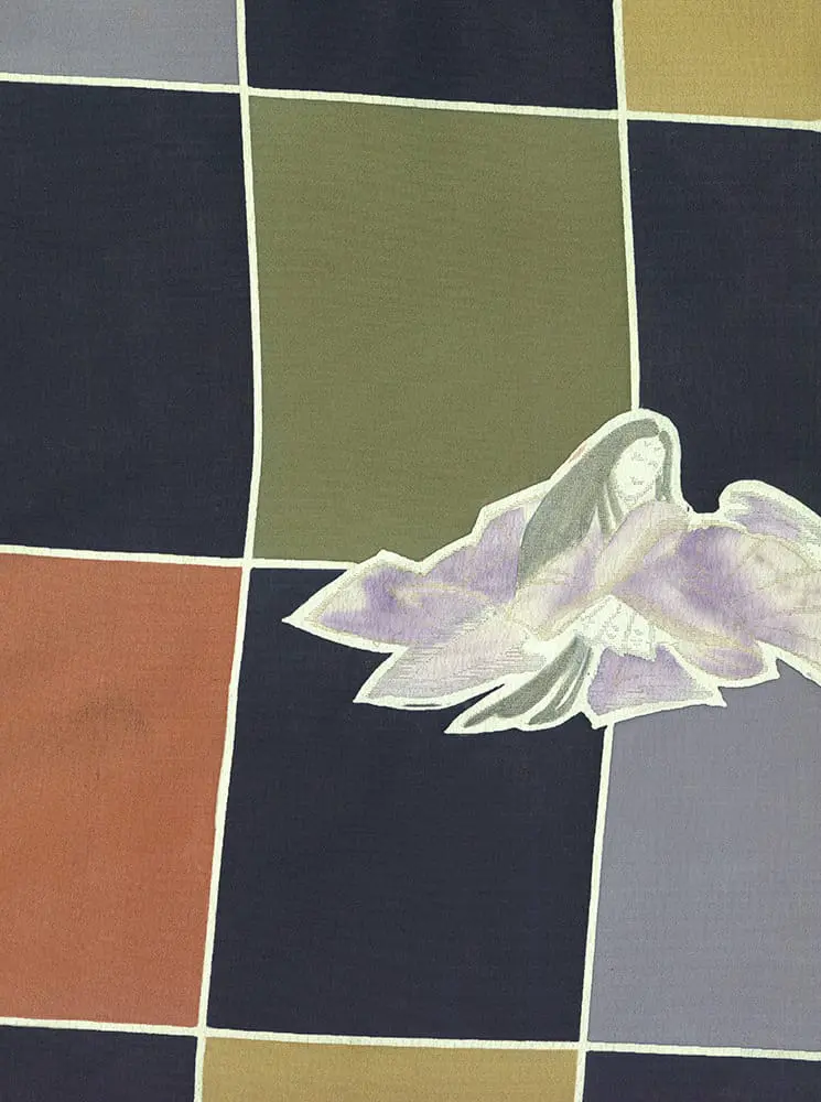 The placement of the ethereal Heian-era noble figures, rendered in metallic thread, appears to float across this geometric backdrop like clouds or apparitions. Their silvery, translucent quality creates a dreamy, supernatural effect that recalls the yamato-e style of classical Japanese painting. These figures add a layer of historical and cultural depth to the piece, while their abstract, simplified forms show an artistic sensibility that would later be reflected in Art Nouveau's flowing, decorative lines and Art Deco's embrace of stylized figures.