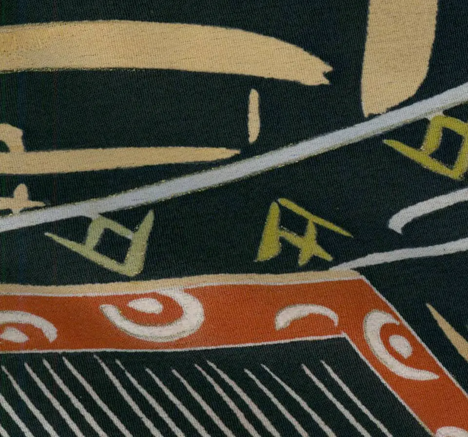 Interspersed among the visual elements are fragments of poetry, likely alluding to the romantic literature of the Heian period. These calligraphic elements, painted freehand with embroidery embellishments, add a lyrical quality to the piece and reinforce its connection to classical Japanese culture. The calligraphy introduces a layer of dynamic movement and spontaneity to the design, reminiscent of Abstract Expressionist works where the artist's gesture and the act of creation itself are emphasized.