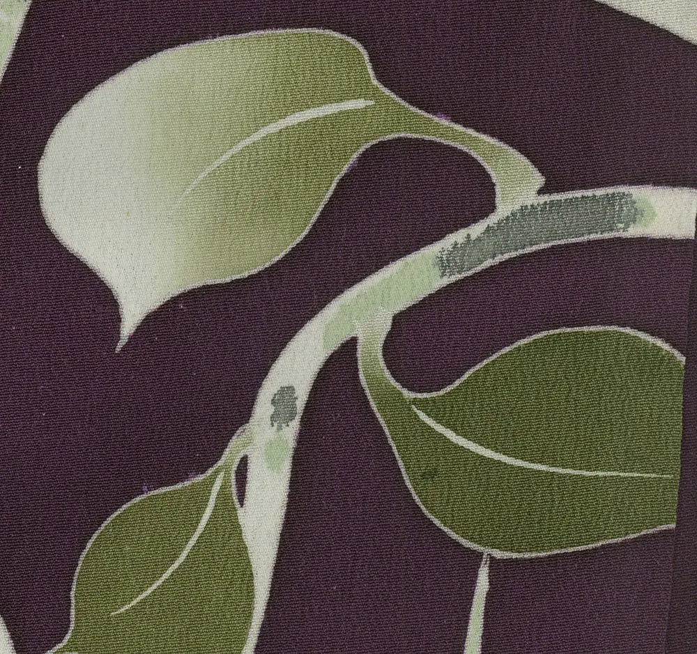 The color palette is particularly refined, with the deep burgundy background providing a rich canvas for the white cockatoo, while the gold, orange, and green accents create points of visual interest without overwhelming the composition. The design shows influence from the Rinpa school's decorative techniques, particularly in its bold use of negative space and stylized natural elements. While the haori's design is firmly rooted in traditional Japanese aesthetics, it also exhibits a subtle affinity with certain aspects of Art Nouveau. The flowing lines of the cockatoo's wings and crest, and the stylized, organic forms of the flowers resonate with the Art Nouveau emphasis on natural forms and decorative elegance. However, unlike the often opulent and elaborate designs of Art Nouveau, the haori's design maintains a sense of restraint and subtlety that is characteristic of Japanese aesthetics. The overall impression of the haori is one of serene beauty and quiet elegance, with a touch of exoticism.