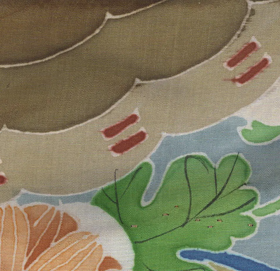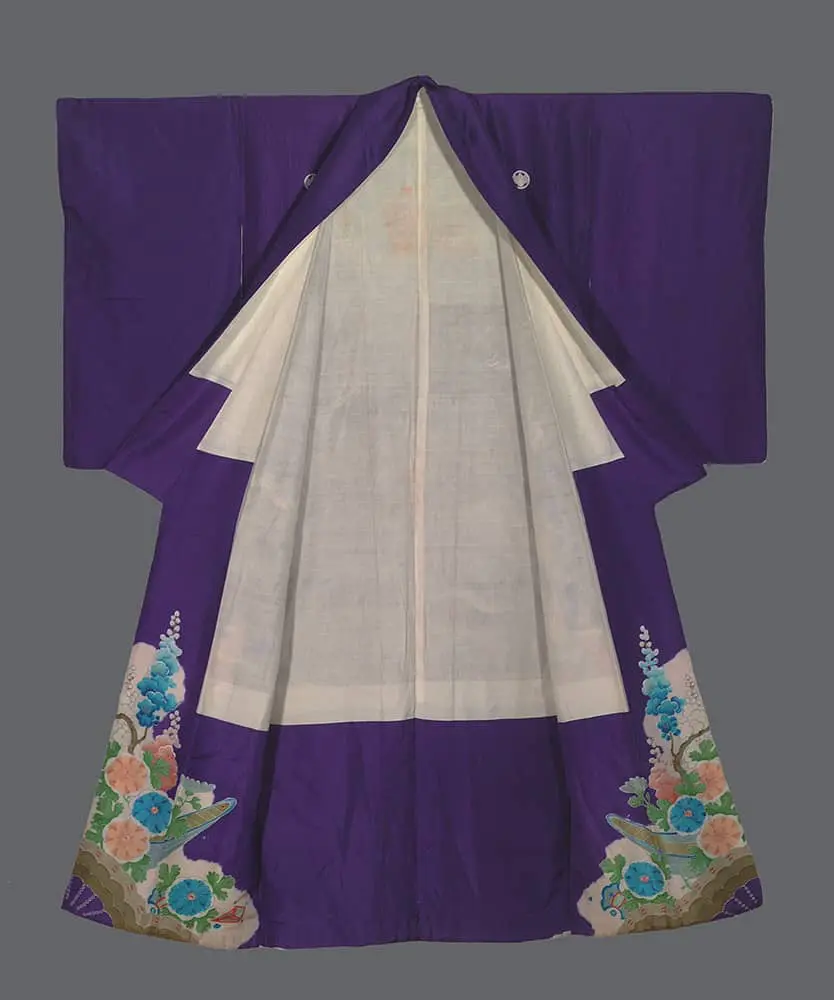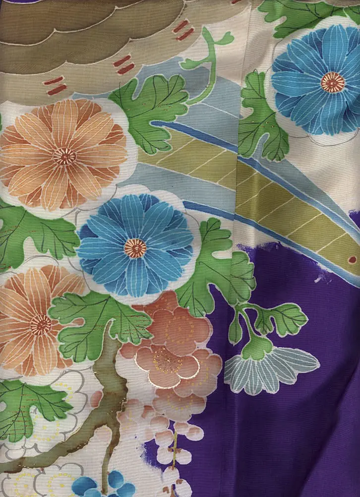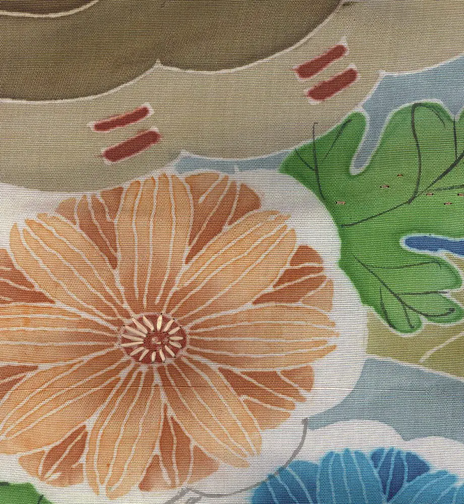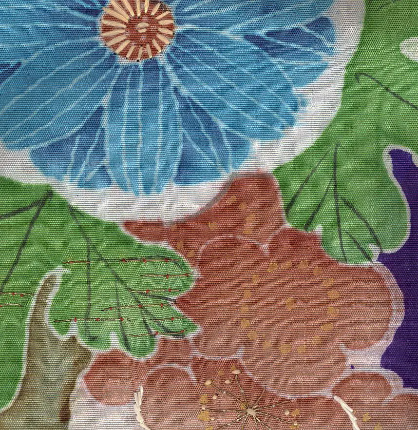 The artistic treatment reflects the period's embrace of more expressive color palettes while maintaining classical floral motifs, suggesting influence from both traditional Japanese decorative arts and the emerging international Art Nouveau movement with its emphasis on naturalistic forms and bold color combinations. The combination of tsutsugaki painting, freehand painted highlights, and multiple embroidery techniques using both silk and metallic threads creates a rich textural surface that would have shimmered and caught light as the wearer moved. This technical complexity and chromatic intensity demonstrate the high level of craftsmanship available to affluent patrons during this period, when traditional textile arts were being revitalized through innovative approaches to color and technique while preserving essential aesthetic principles of balance and seasonal appropriateness.