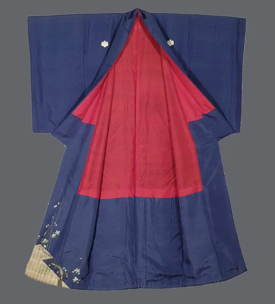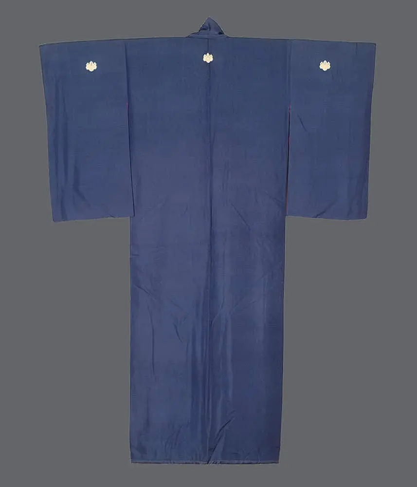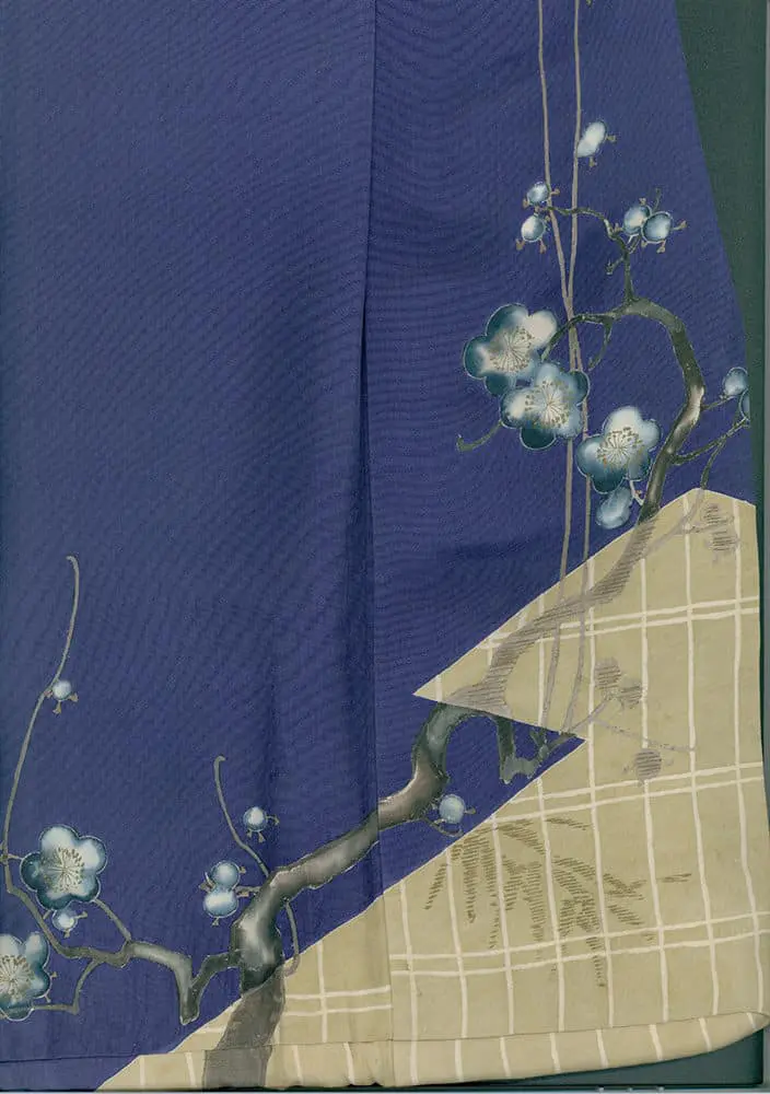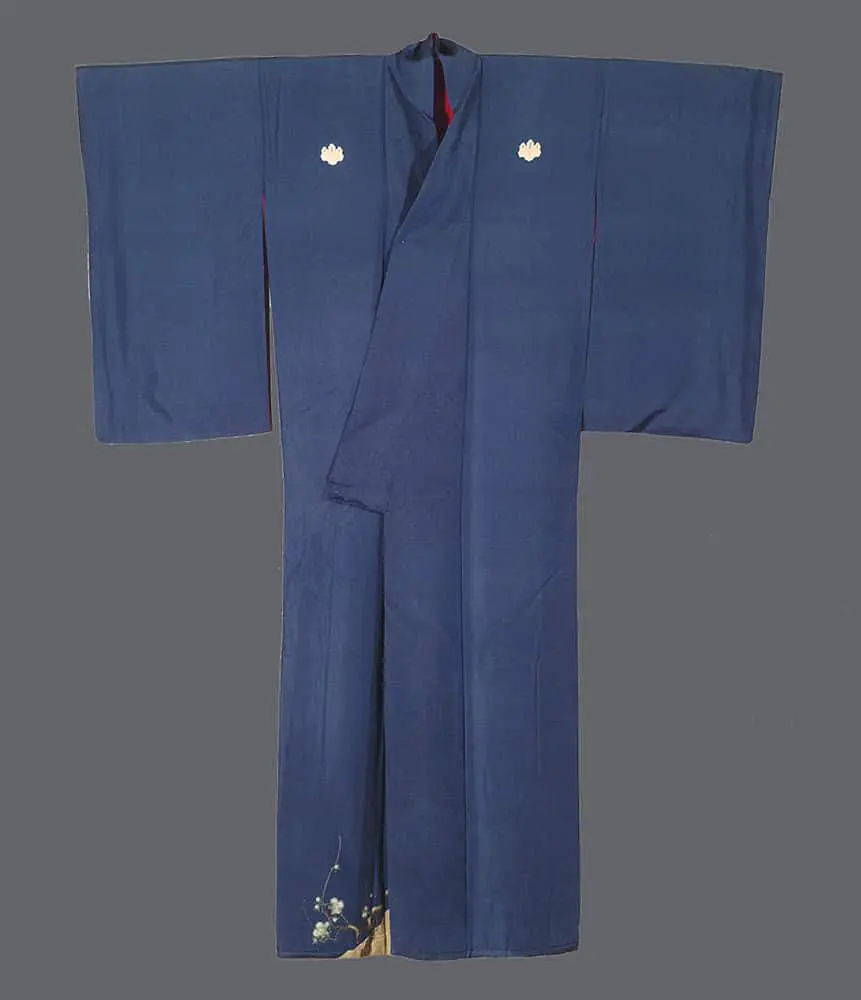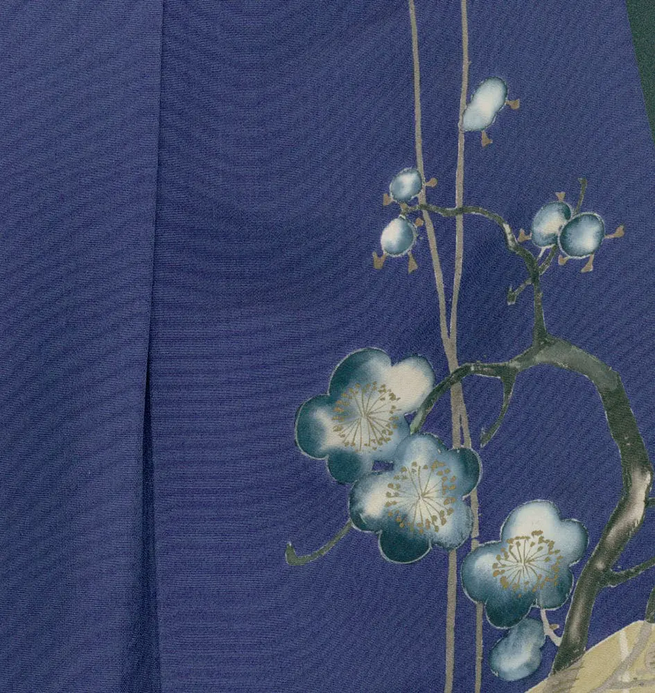 This formal blue silk kimono's deep indigo ground creates a serene, contemplative canvas that emphasizes the exquisite yuzen-painted design positioned along the lower hem. This strategic placement of ornamentation follows classical kimono design principles, where decoration is often concentrated at specific zones to create visual balance and movement when the garment is worn.