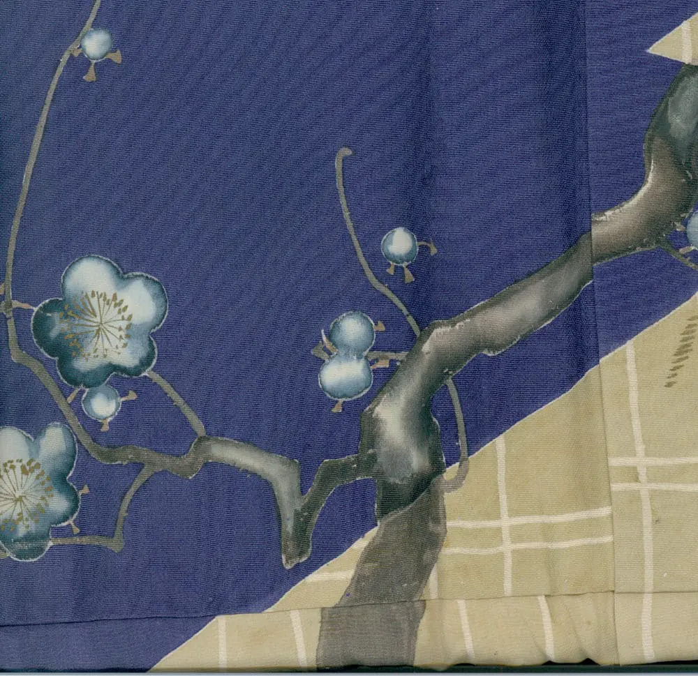 The detailed imagery reveals delicate plum blossoms (ume) rendered in soft blue-green tones with white stamens, emerging from gracefully curved branches that flow across a geometric background pattern. The plum blossom holds profound symbolic meaning in Japanese culture, representing perseverance, hope, and the promise of spring, as these flowers courageously bloom in winter's harsh conditions. This motif was particularly favored for formal wear, as it conveyed both aesthetic beauty and moral virtue. The presence of five mon (family crests) visible as small white medallions on the shoulders and back confirms this kimono's formal status, indicating it was worn for ceremonial occasions such as weddings, coming-of-age celebrations, or other significant social events. The yuzen painting technique, with its characteristic fluid brushwork and subtle color gradations, demonstrates the high level of craftsmanship expected in formal garments of this period, when traditional textile arts were being preserved and refined even as Japan was rapidly modernizing.