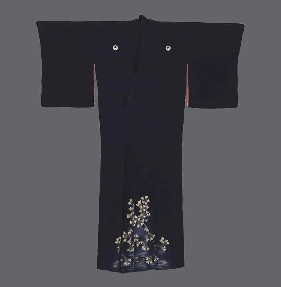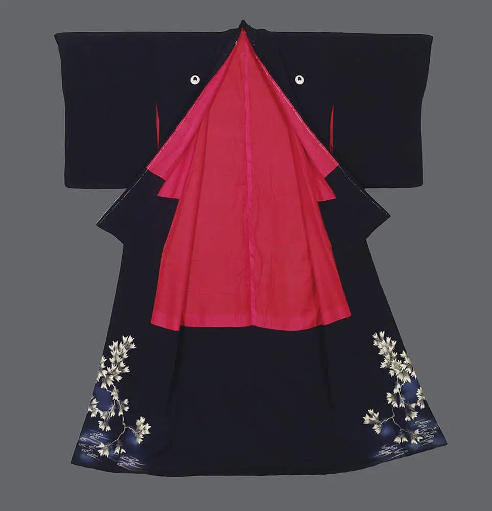 This elegant silk kurotomesode's dramatic black expanse creates a powerful visual foundation that speaks to the aesthetic principles of ma (negative space) and simplicity that are fundamental to Japanese design philosophy, while simultaneously reflecting the influence of Western formal wear conventions that were being integrated into Japanese fashion during this period of cultural exchange. The strategic placement of decoration exclusively at the hem follows the traditional kurotomesode format, creating a composition that emphasizes elegance through restraint rather than opulent display.