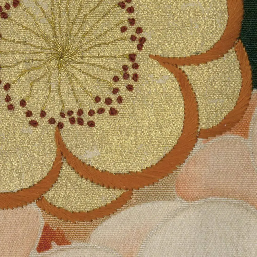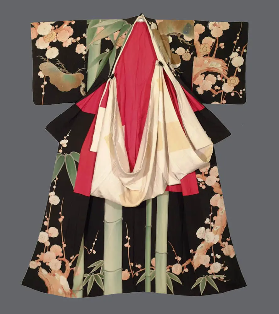 The interior reveals an equally elaborate design, with silk and metallic embroidery adding dimensional richness to the already complex surface decoration. This attention to unseen details reflects the Japanese concept of omotenashi - the spirit of wholehearted service and attention to every aspect of craftsmanship, even those hidden from view. The overall effect creates a wearable work of art that embodies centuries of textile tradition while reflecting the refined taste of Japan's cultural elite during this transformative historical period.