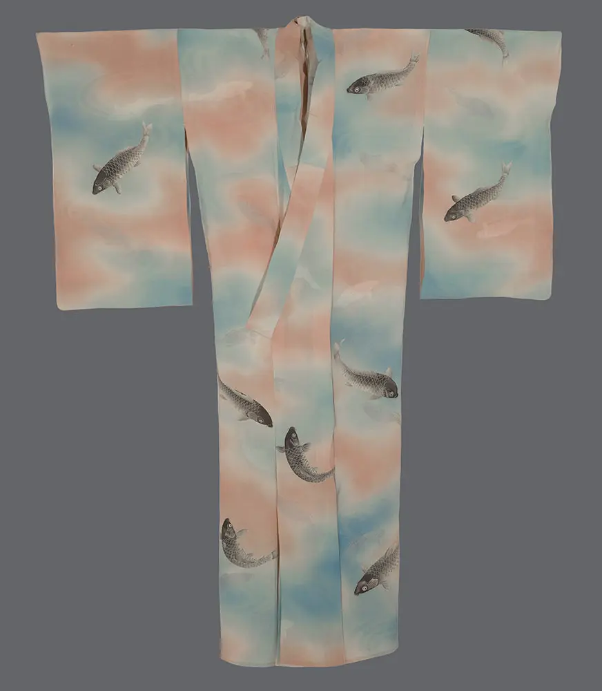 The employment of the "fuzzy effect" embroidery technique for the white and silver carp demonstrates the highest level of craftsmanship, where parallel stitches deliberately avoid touching to allow glimpses of the underlying fabric, creating a subtle, almost ghostly presence that enhances the sense of fish moving through water. This technical approach reflects the Japanese aesthetic principle of ma, or meaningful emptiness, where what is not shown becomes as important as what is depicted. The overall composition evokes the influence of naturalist movements in art while maintaining distinctly Japanese sensibilities about the harmony between technique, symbolism, and seasonal appropriateness, making this summer kimono not merely a garment but a wearable meditation on the cycles of nature and the persistence of life.