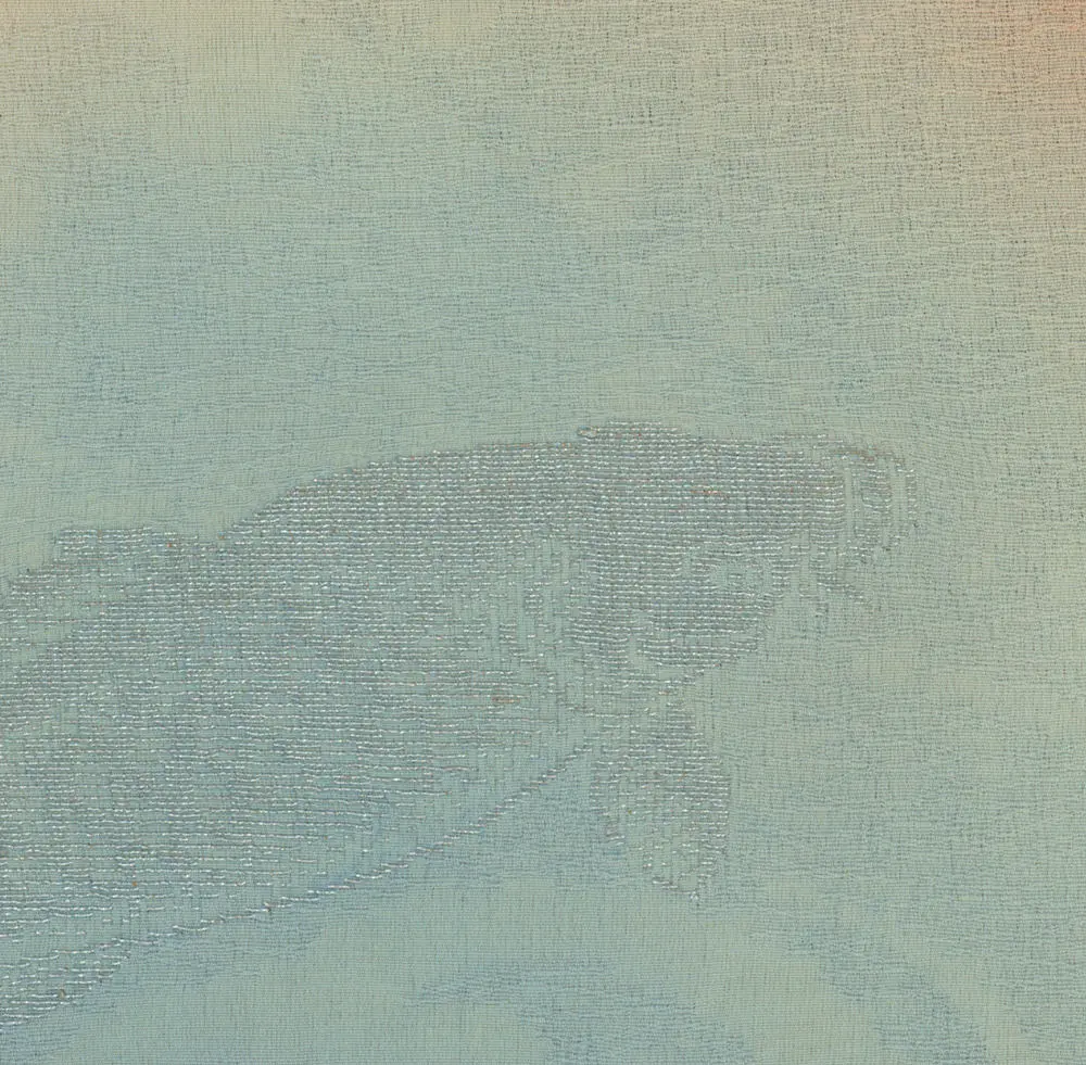 This extraordinary kinsha silk summer kimono represents a masterpiece of Japanese textile artistry, demonstrating the sophisticated interplay between multiple decorative techniques and the profound symbolism of the carp motif. The garment's ethereal quality emerges from its layered approach to depicting carp swimming through water, created through a carefully orchestrated combination of yuzen dyeing, embroidery, and the innovative use of rinzu damask weaving. The base fabric itself becomes part of the artistic narrative, with plain crepe areas representing flowing water contrasting against abstract ribbed textures that suggest the movement and depth of an aquatic environment.