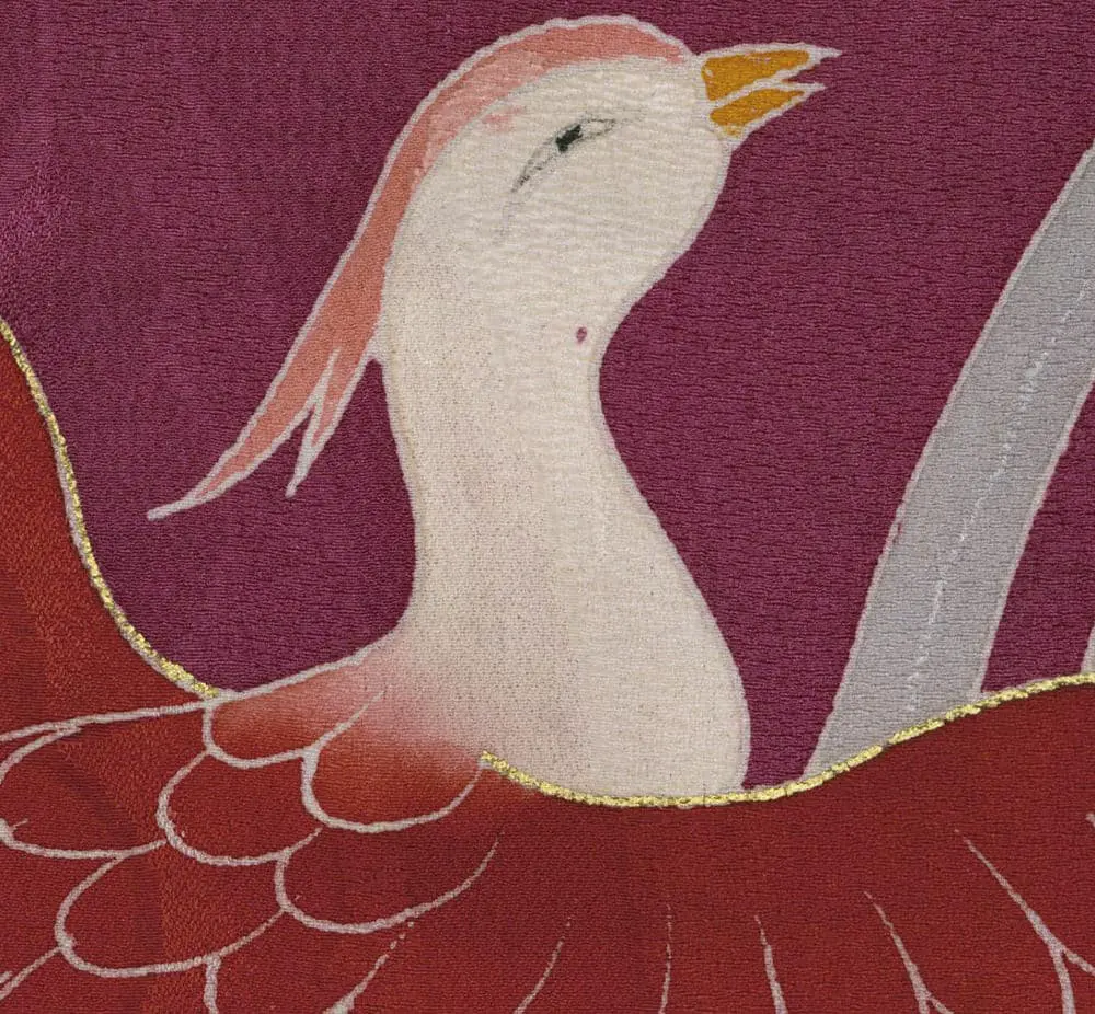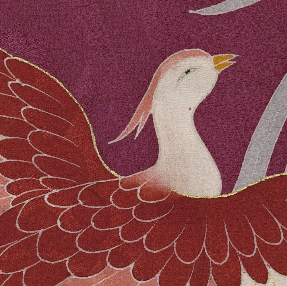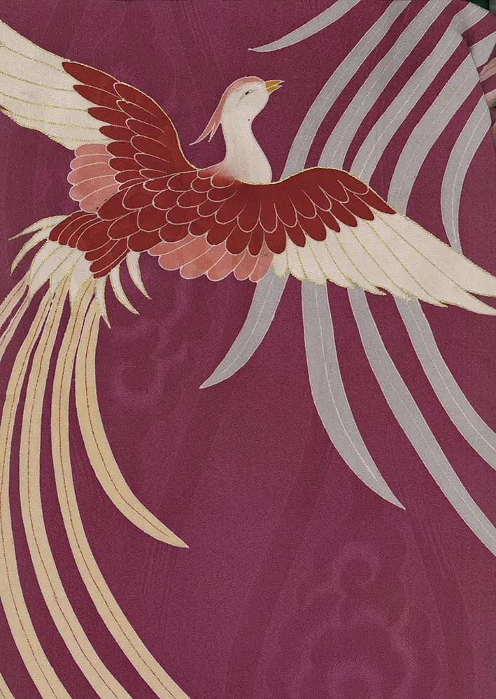 The composition reflects the cultural optimism and renewal of Japan's recovery period, when traditional motifs like the phoenix gained renewed relevance as symbols of national and personal regeneration. The slightly gritty texture adds tactile richness that enhances the visual complexity of the design, while the integration of Buddhist cloud motifs with the Taoist-influenced phoenix creates a syncretic spiritual landscape that was particularly meaningful during this era of cultural rebuilding. The bold yet harmonious color palette and the dynamic asymmetrical placement of the phoenixes across the kimono's panels demonstrate how mid-century Japanese designers successfully modernized classical themes.