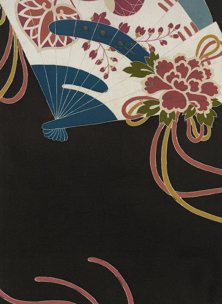 The symbolic richness of the fan motif carries deep cultural significance, representing not only the practical elegance of courtly life but also the concepts of expansion, good fortune, and the unfolding of life's possibilities—making it an auspicious choice for formal wear. The single family crest (mon) embroidered onto the garment serves as both a mark of ownership and social status, integrating seamlessly into the overall design while maintaining the wearer's connection to ancestral lineage. The sophisticated interplay between the geometric structure of the fans and the organic flow of the floral elements, combined with the masterful use of negative space in the black silk ground, creates a textile that bridges traditional Japanese aesthetic principles with the bold graphic sensibilities emerging in the early 20th century.