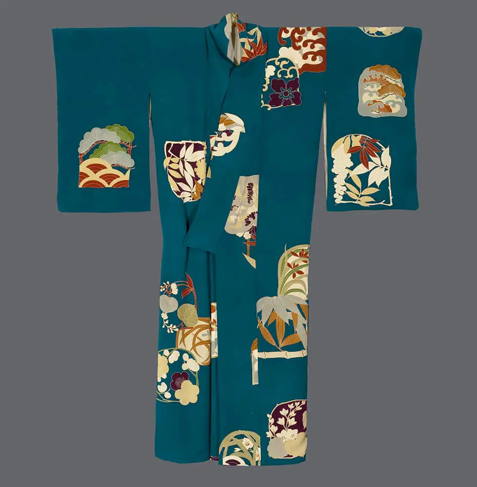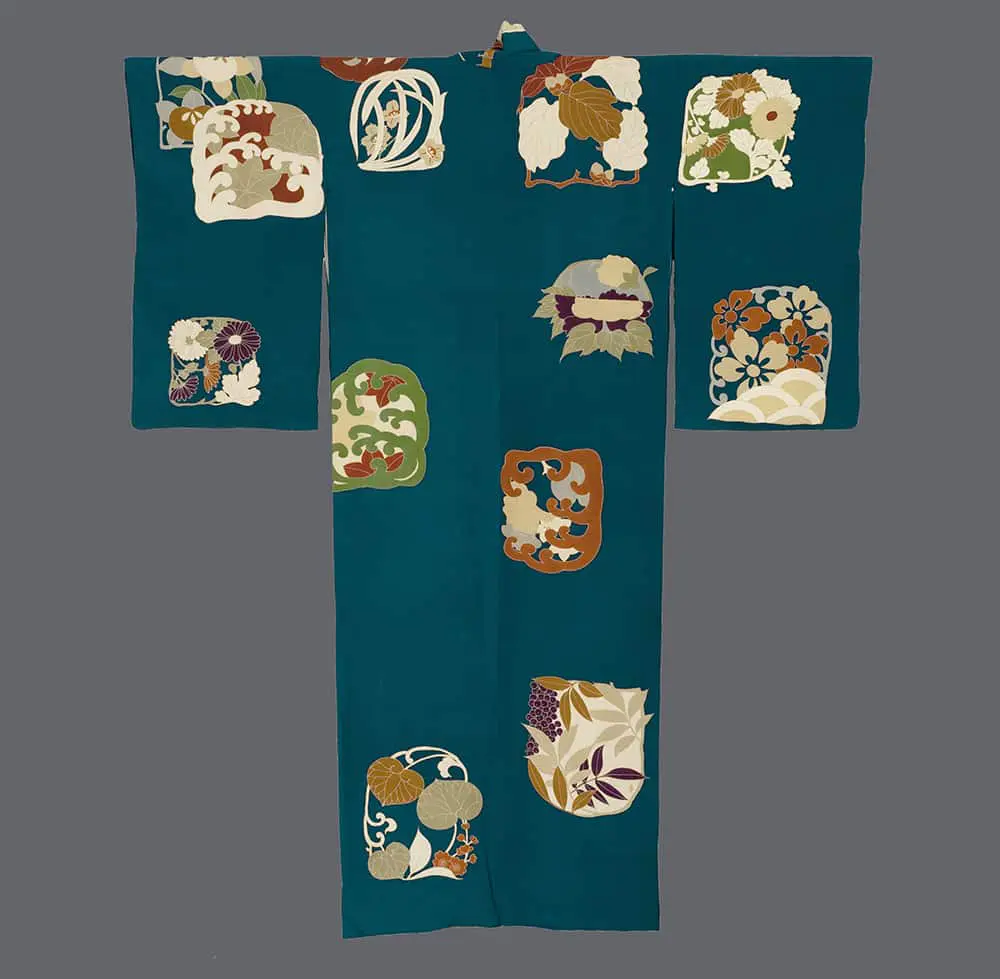 This chirimen silk kimono represents a bold departure from traditional Japanese textile design conventions, embodying the experimental spirit and cultural dynamism of early 20th-century Japan. Set against a vibrant teal ground, the garment features an innovative composition of discrete pictorial vignettes—each functioning as an independent "painting" within irregularly shaped frames scattered across the kimono's surface. These motifs encompass a diverse range of subjects including stylized waves, various floral arrangements, geometric patterns, and naturalistic elements, all rendered through masterful yuzen-painting techniques that achieve remarkable color saturation and precise linear definition.