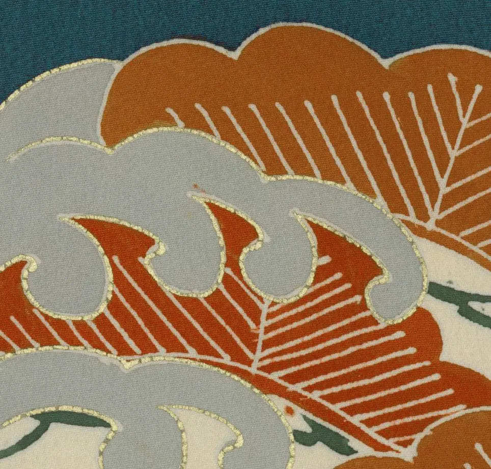 The design philosophy reflects the profound cultural shifts occurring during the Taishō era, when Japan was actively synthesizing Western artistic concepts with traditional Japanese aesthetics. The fragmented, collage-like approach to surface decoration suggests influences from contemporary movements in Western art, particularly the emerging modernist sensibilities that emphasized compositional experimentation and the breakdown of unified pictorial space. The close-up details reveal the sophisticated technical execution, with bold cloud-like forms outlined in metallic thread creating dynamic movement across warm orange and coral backgrounds.