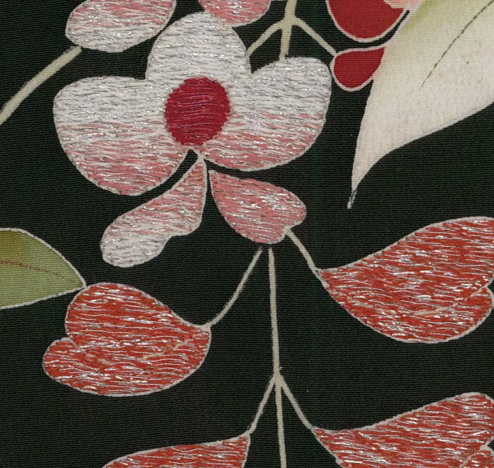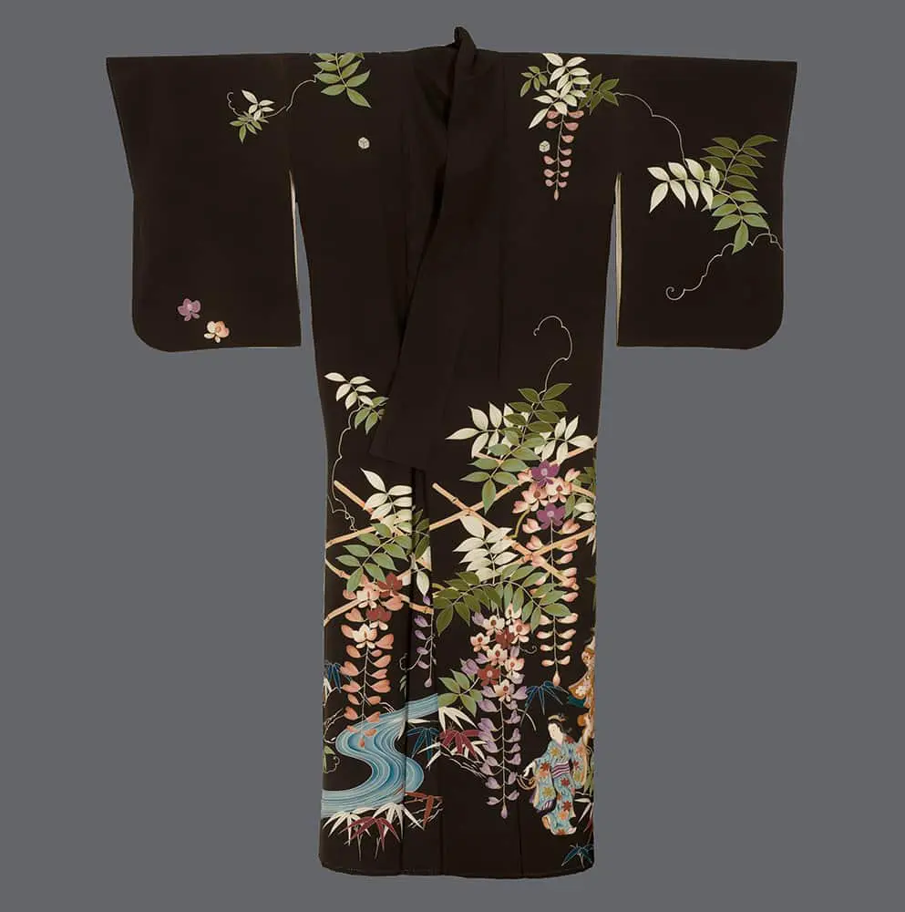 The five family crests (mon) integrated into the design elevate this piece to the highest level of formality, while the seasonal specificity of the wisteria motif demonstrates the Japanese aesthetic principle of mono no aware - the appreciation of seasonal beauty and transience. This kimono represents a pinnacle of Japanese textile artistry, combining centuries-old techniques with the cosmopolitan artistic sensibilities of the interwar period.