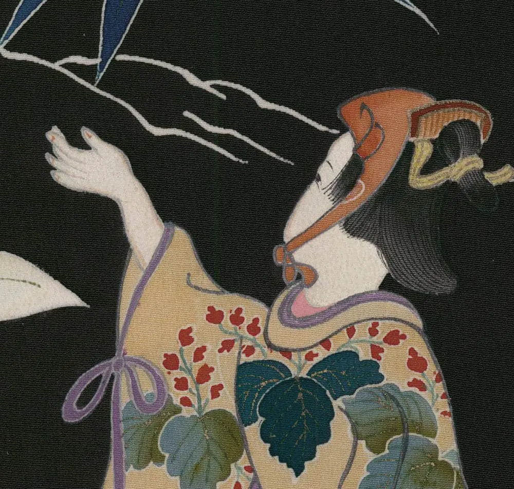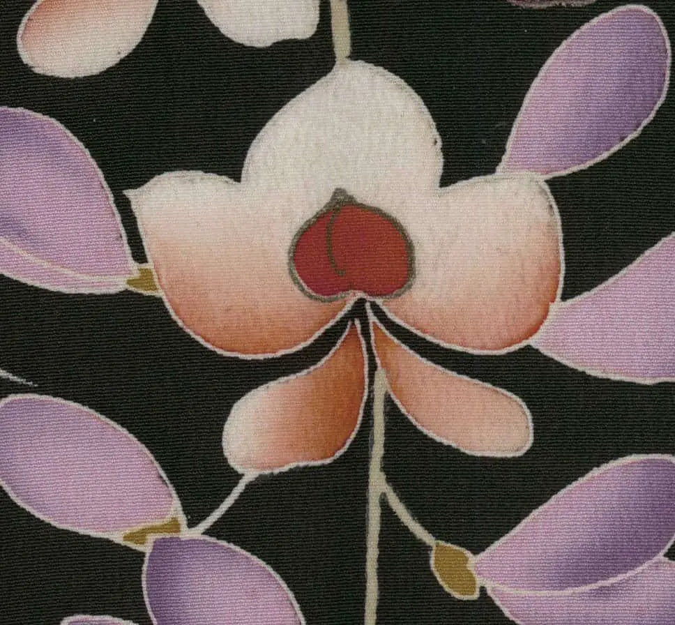 The textile displays a carefully orchestrated scene of three dancing figures set within a lush wisteria garden against a dramatic black background. The composition demonstrates the influence of the Japanese Art Nouveau movement (known as "Art Nouveau Japonais"), which emerged in the early 1900s and emphasized flowing, organic forms and naturalistic motifs. The cascading wisteria blossoms, rendered in delicate pink and white gradations, create sinuous lines that echo the decorative principles of this movement.