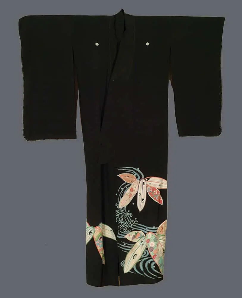 This formal chirimen-silk kurotomesode features a dynamic composition of stylized bamboo leaves rendered in soft coral and cream tones, their forms appearing to float and dance across swirling streams of pale blue water that create sinuous pathways through the dark ground. The bamboo motifs are executed with exceptional technical precision through paste-resist dyeing methods, allowing for crisp edges and subtle color gradations that give each leaf a sense of individual character and movement.
