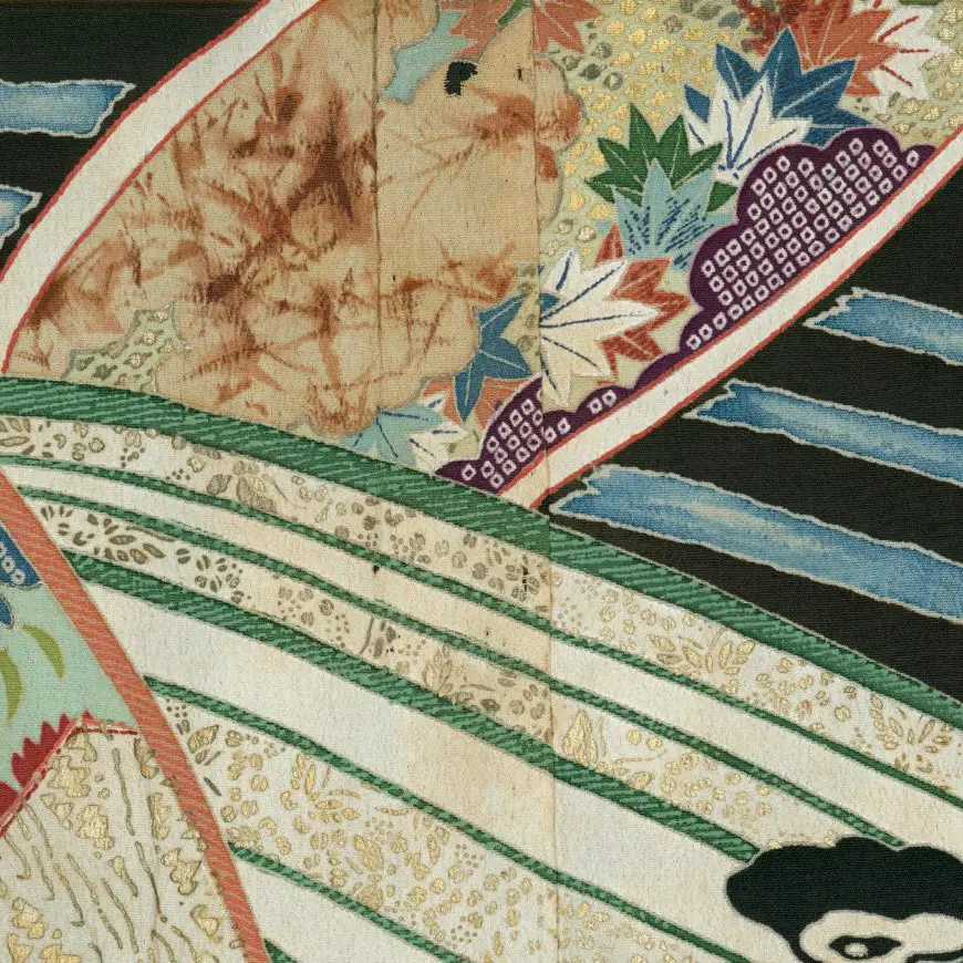 The artistic treatment reflects the influence of both classical Rinpa school aesthetics, with its bold asymmetrical compositions and natural motifs, and the emerging modernist sensibilities of the early 20th century that favored simplified forms and sophisticated color relationships. Bamboo carries profound symbolic meaning in Japanese culture, representing resilience, flexibility, and rapid growth - qualities particularly appropriate for formal occasions celebrating life transitions. The integration of delicate embroidery work and metallic foil highlights adds textural richness and subtle luminosity to the design, creating depth and visual interest that would catch light beautifully during formal ceremonies.