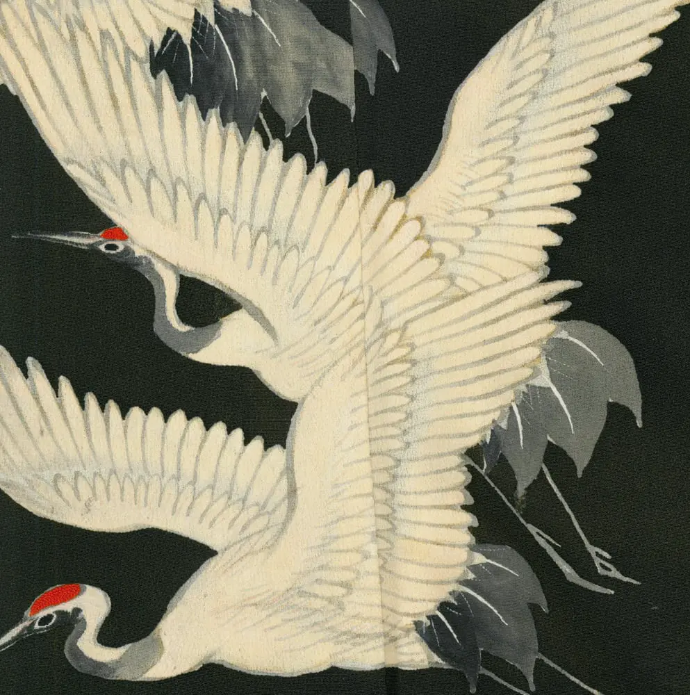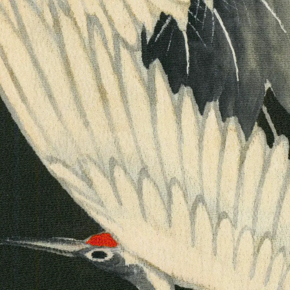 The symbolic resonance of the crane motif operates on multiple levels, representing longevity, fidelity, good fortune, and spiritual transcendence - making this garment particularly appropriate for celebratory occasions and formal ceremonies. The detail images reveal the remarkable technical mastery evident in the individual crane renderings, where each feather is meticulously articulated through a combination of painted and embroidered techniques that create convincing textural variety and dimensional depth. The composition's emphasis on flight and movement transforms the static medium of textile into something that captures the essence of freedom and aspiration, while the monochromatic palette ensures that the wearer's sophistication and refinement remain the focus rather than ostentatious display, perfectly embodying the Japanese aesthetic principle of understated elegance.