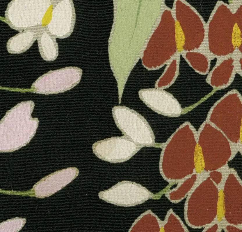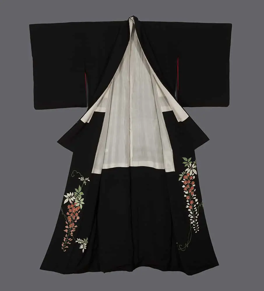 The wisteria motif carries deep symbolic meaning in Japanese culture, representing beauty, love, and the ephemeral nature of life, making it particularly appropriate for formal occasions where kurotomesode are worn by married women. The artistic treatment reflects the influence of classical Japanese screen painting traditions, where seasonal flowers are depicted with both naturalistic detail and decorative stylization. The strategic placement of the motifs around the hem creates a sense of the flowering vines hanging naturally, as if the wearer is walking through a wisteria garden in late spring. The choice of kinsha crepe as the base fabric adds subtle texture that enhances the lustrous quality of the yuzen-painted surfaces, while the formal black ground provides the dignified restraint appropriate to the garment's ceremonial function.