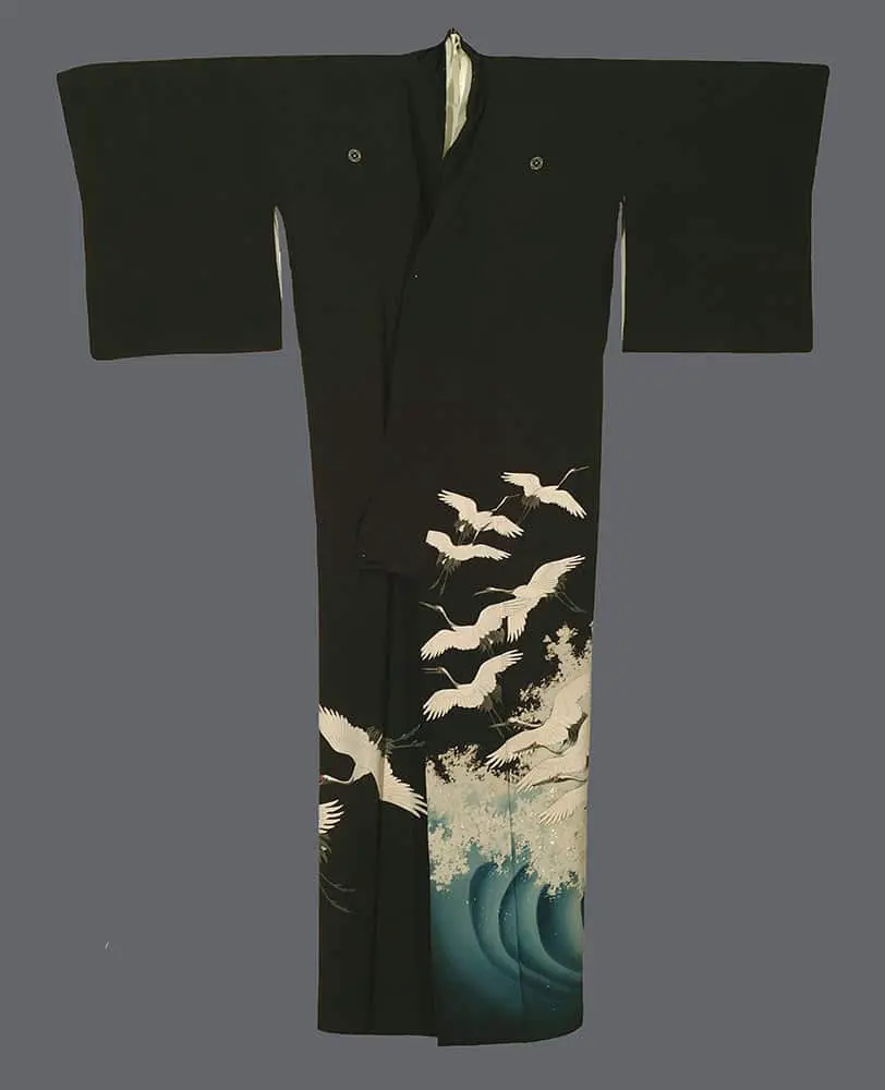 The artistic treatment reveals influences from both classical Japanese painting traditions and the period's embrace of more naturalistic representation, moving beyond stylized convention toward a more dynamic portrayal of nature in motion. The raging waves beneath the cranes, rendered in brilliant turquoise with white foam caps, create a sense of elemental power that contrasts beautifully with the serene flight of the birds above. The strategic application of silver foil highlights not only adds luxurious texture but also creates the illusion of light playing across feathers and water, demonstrating the period's technical innovations in textile decoration. This piece represents the height of kurotomesode artistry, where every element—from the rich black silk ground to the precise placement of decorative motifs—works in harmony to create a garment that is both ceremonially appropriate and artistically transcendent.