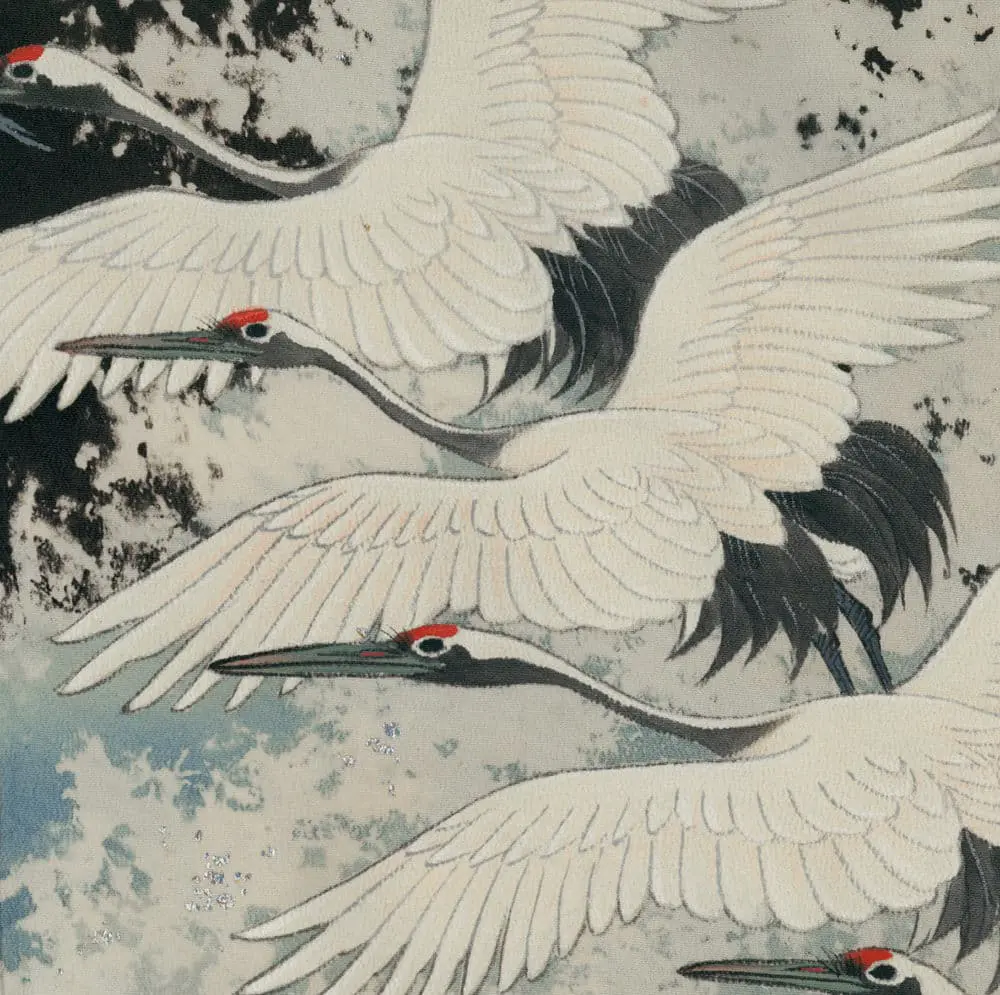 This magnificent chirimen silk kurotomesode exemplifies the sophisticated fusion of traditional Japanese symbolism with dynamic artistic expression that characterized the era's most refined formal wear. The composition features a dramatic flock of cranes in flight, rendered through masterful yuzen painting techniques that capture both the individual grace of each bird and their collective movement across the garment's lower register. The cranes, symbols of longevity, good fortune, and marital fidelity, are depicted with meticulous attention to anatomical detail—their outstretched wings showing careful gradations of white and gray, while touches of coral red on their crowns provide subtle color accents against the deep black ground.