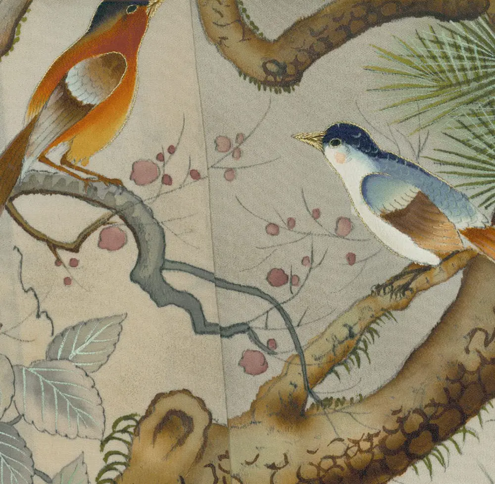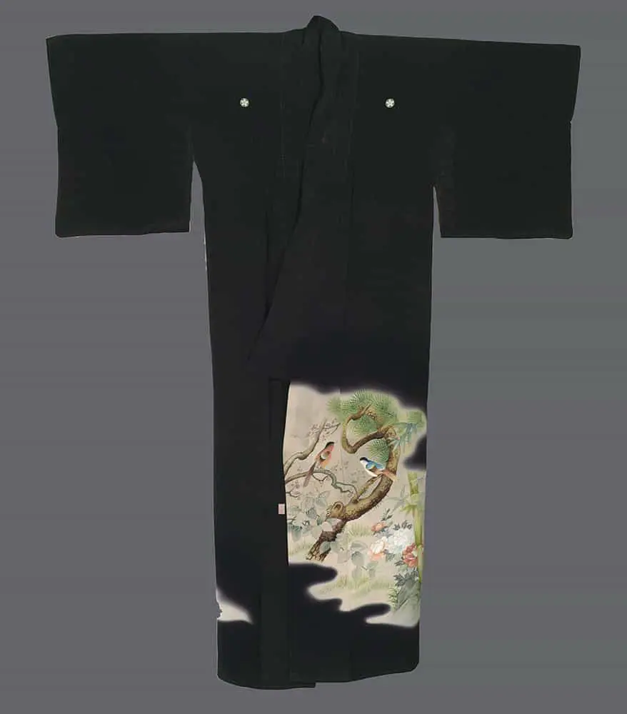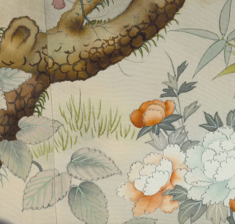 The artistic treatment reflects the enduring influence of classical Japanese painting schools, particularly the Maruyama-Shijo tradition that emphasized direct observation of nature, while the sparse yet elegant distribution of motifs demonstrates the aesthetic principle of ma (meaningful emptiness) that allows each element to resonate with quiet dignity. The bamboo, rendered in pale green washes, symbolizes resilience and virtue, while the small birds represent joy and the promise of spring's return even in winter's depths. Delicate plum blossoms or similar seasonal flowers provide subtle color accents in soft pinks, their presence suggesting the cyclical nature of seasons and renewal. The integration of metallic embroidery highlights adds textural richness and subtle luminosity that would catch candlelight during formal evening occasions, elevating this garment beyond mere clothing to become a canvas for celebrating the refined beauty of the natural world through the lens of traditional Japanese artistic sensibility.