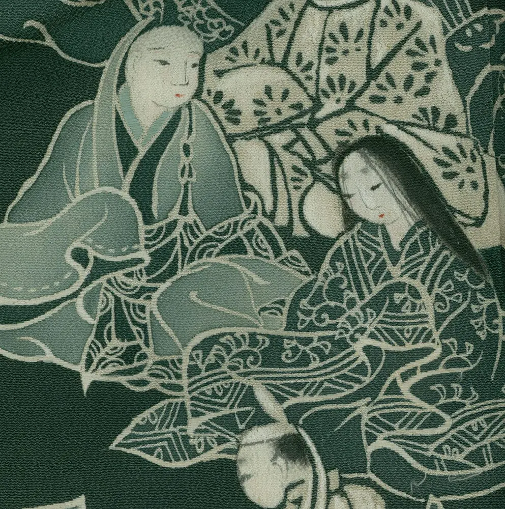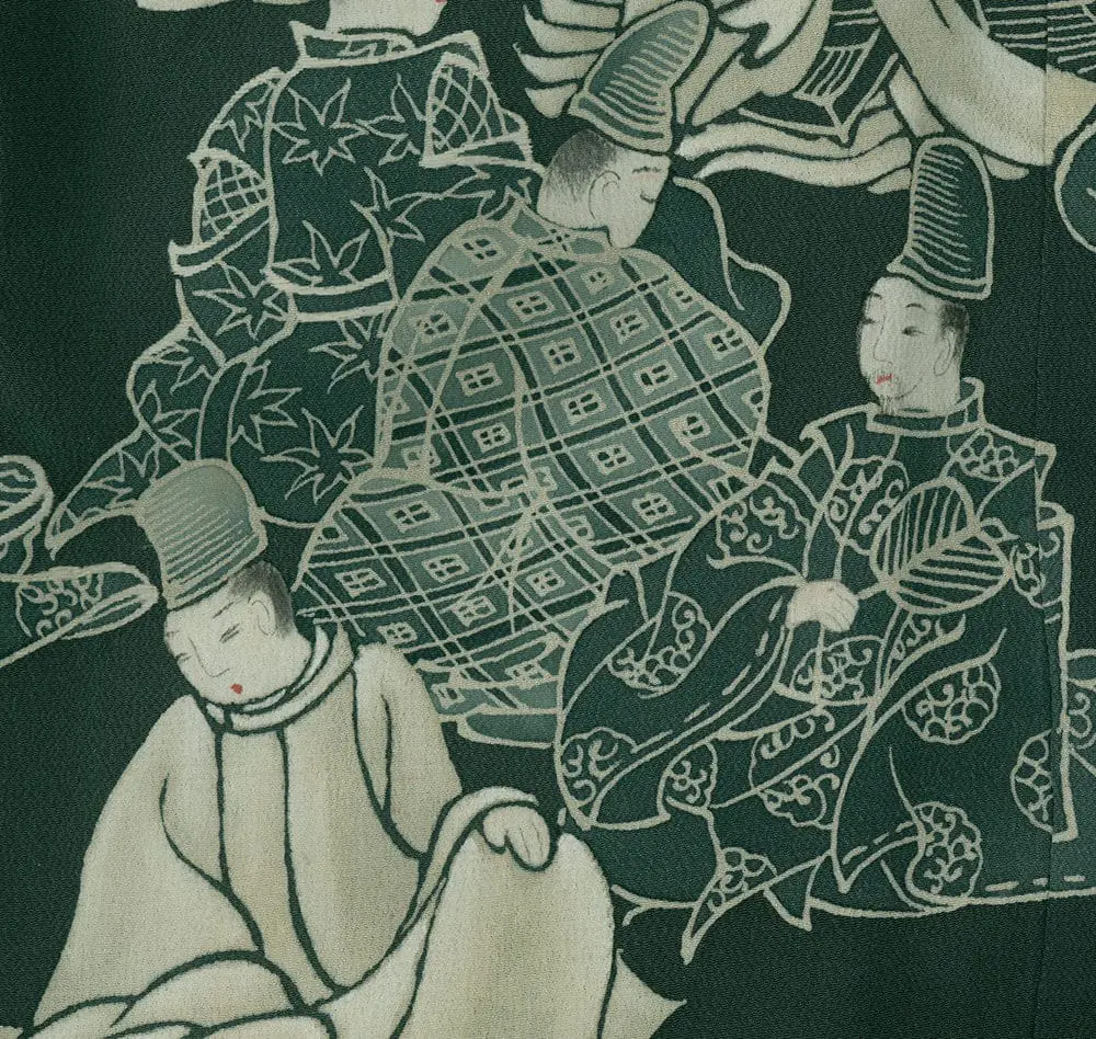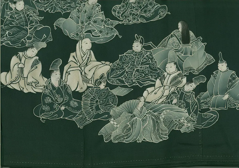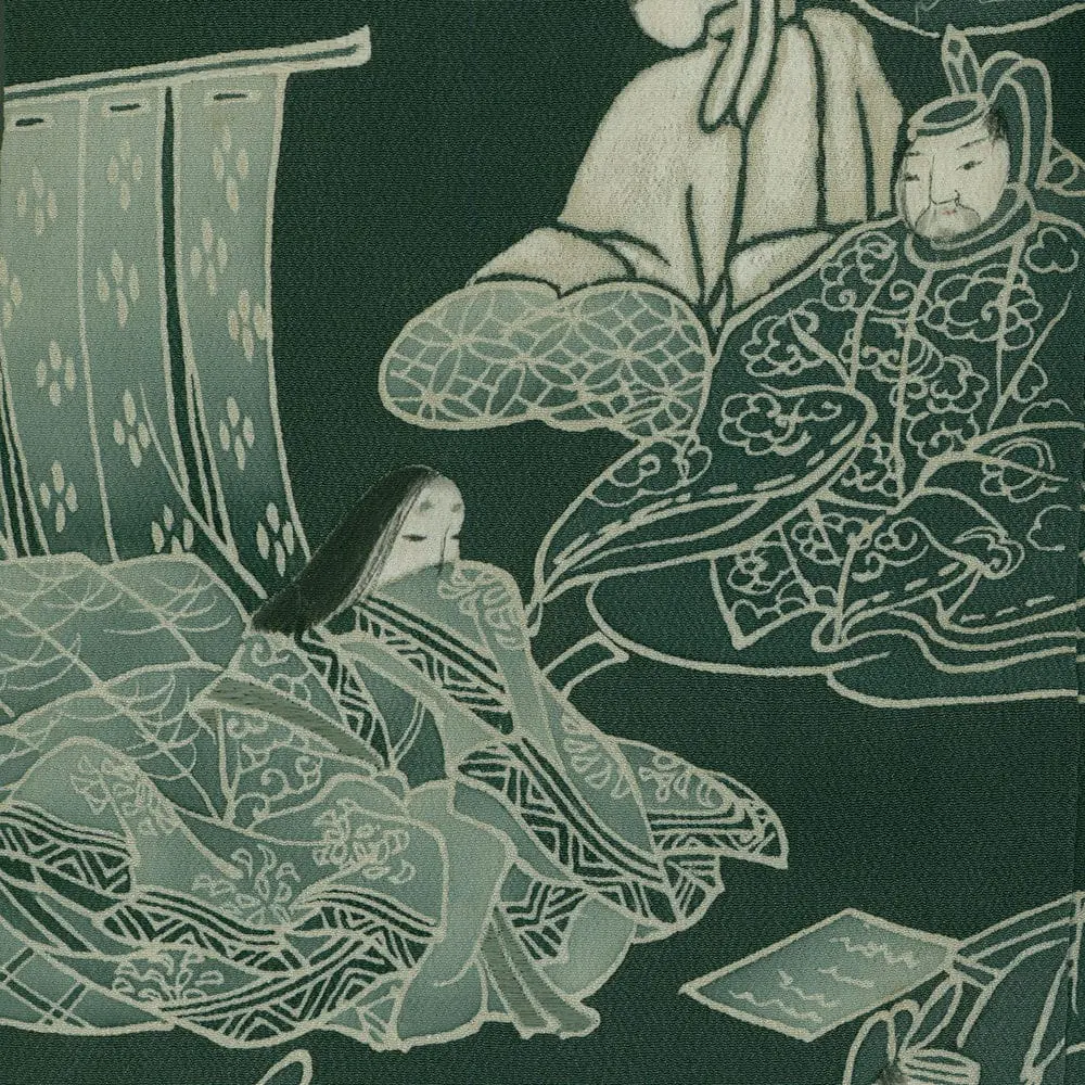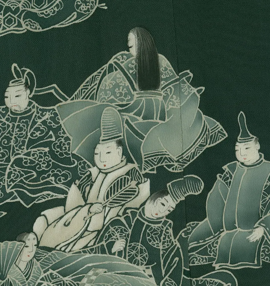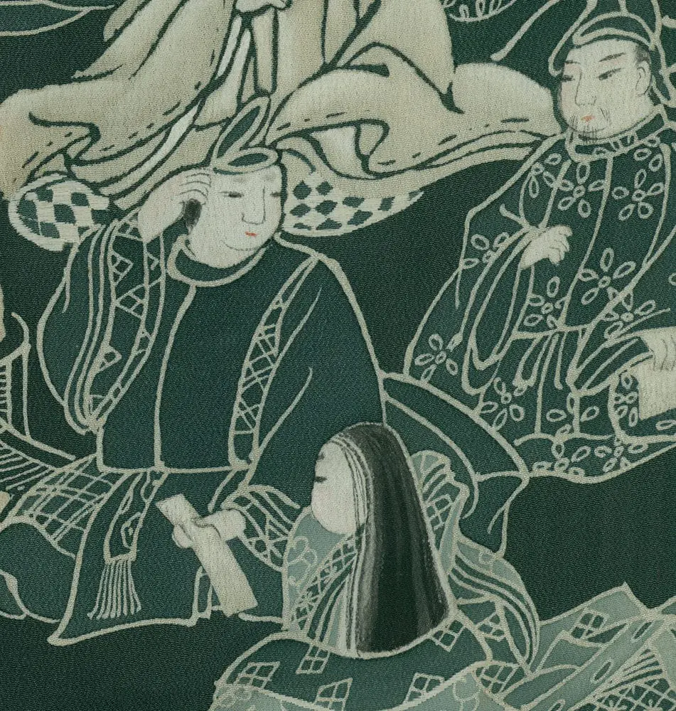 This exceptional mid-19th century chirimen silk tomesode represents a masterful example of historical narrative textile art, where yuzen painting techniques bring to life elaborate scenes from Japan's classical Heian period (794-1185). The composition features elegantly rendered court figures in traditional dress, their flowing robes and refined postures capturing the aesthetic ideals of aristocratic life that defined Japan's golden age of literature and culture. The deep forest green background creates a dramatic stage for these pale, luminous figures, while the strategic placement of the narrative scenes along the lower portion of the garment follows the formal conventions of tomesode design, appropriate for married women of high social standing.