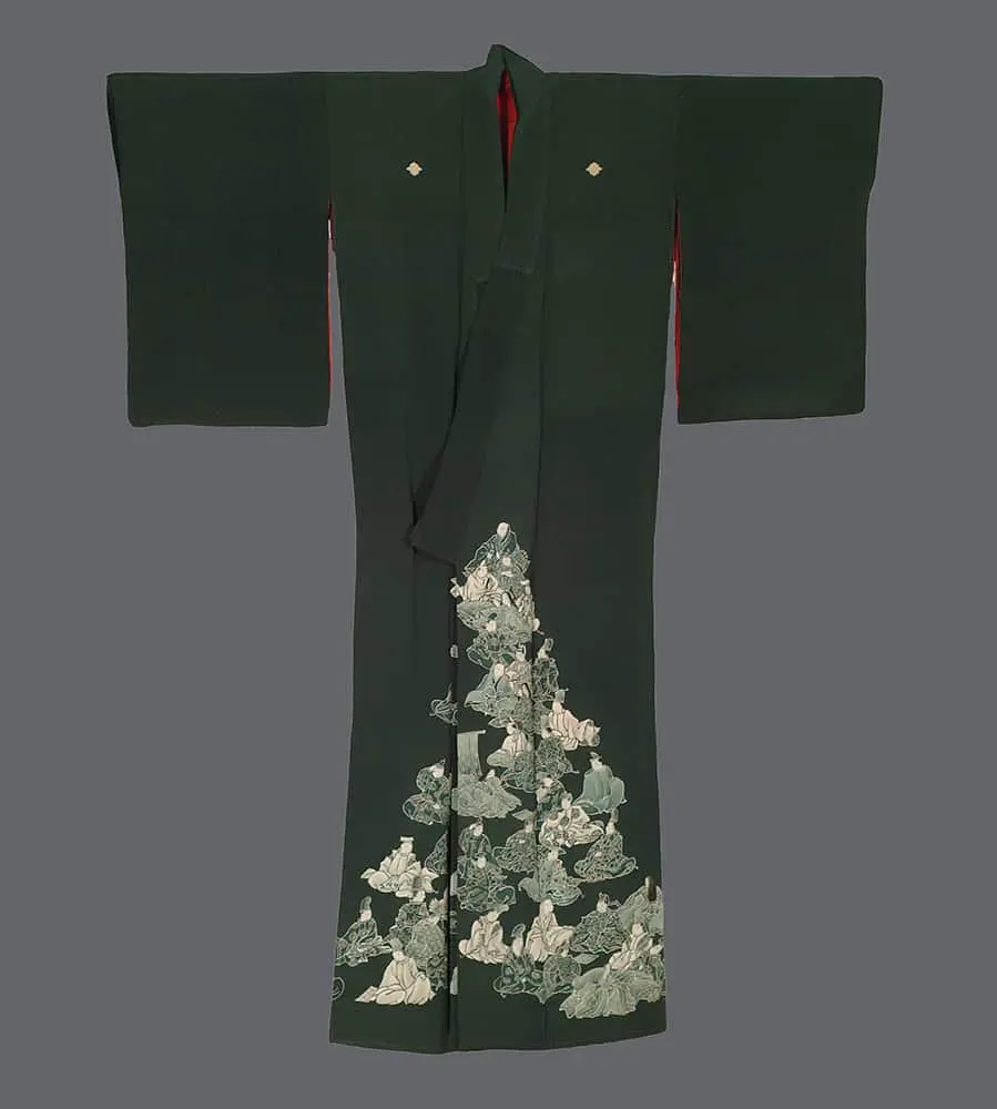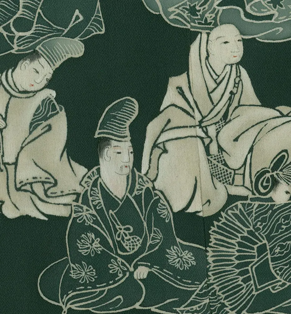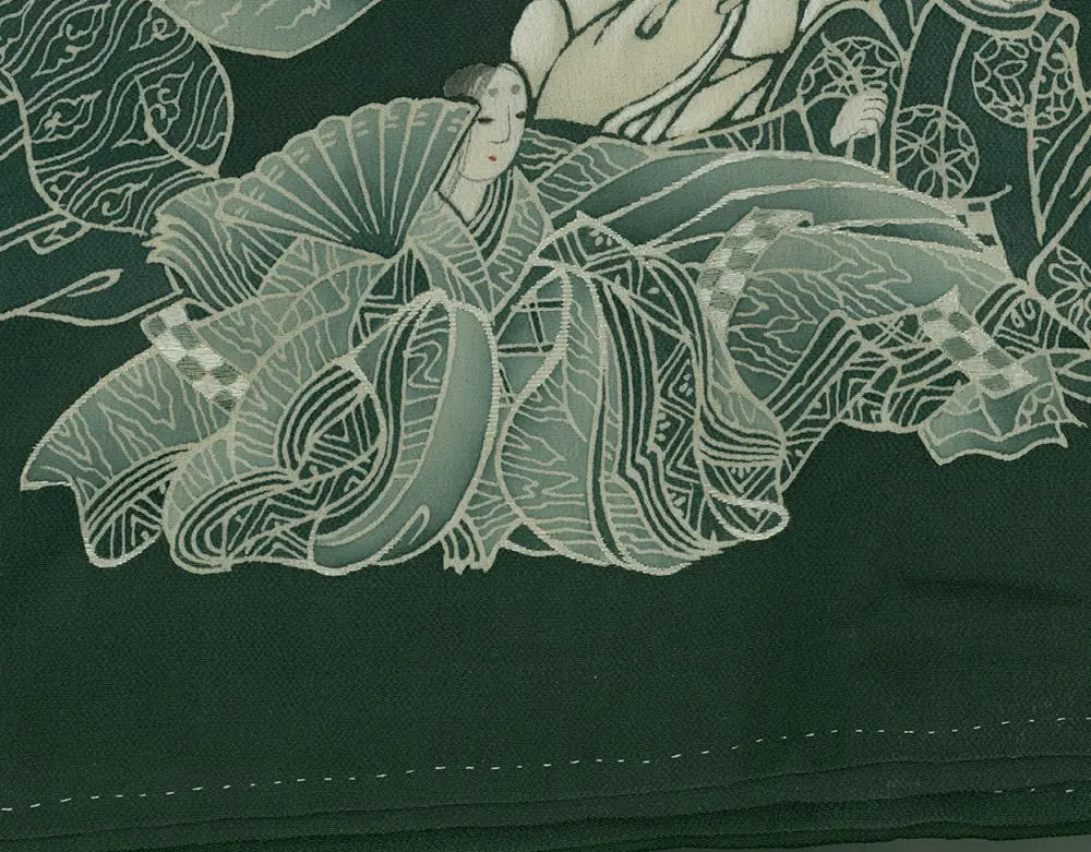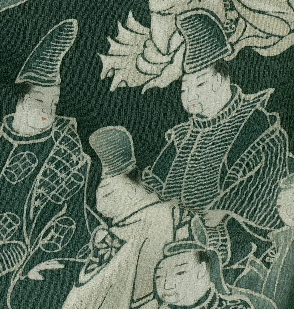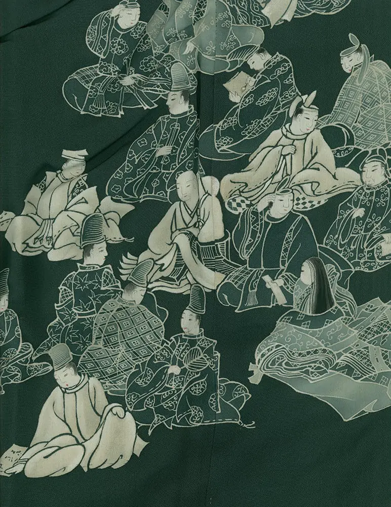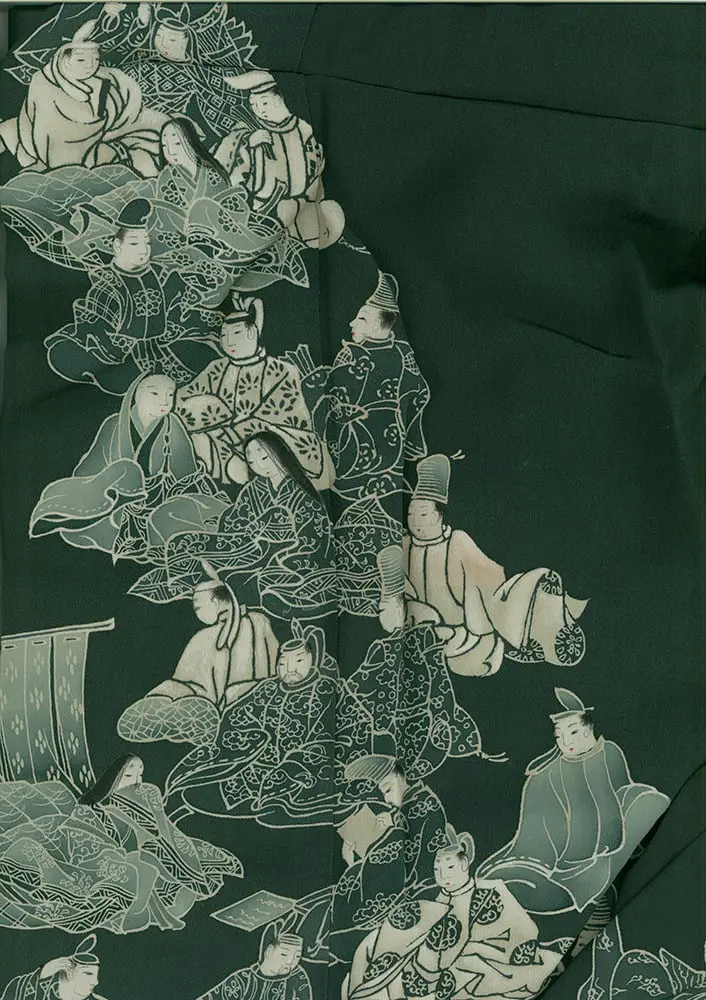 This exceptional mid-19th century chirimen silk tomesode represents a masterful example of historical narrative textile art, where yuzen painting techniques bring to life elaborate scenes from Japan's classical Heian period (794-1185). The composition features elegantly rendered court figures in traditional dress, their flowing robes and refined postures capturing the aesthetic ideals of aristocratic life that defined Japan's golden age of literature and culture. The deep forest green background creates a dramatic stage for these pale, luminous figures, while the strategic placement of the narrative scenes along the lower portion of the garment follows the formal conventions of tomesode design, appropriate for married women of high social standing.