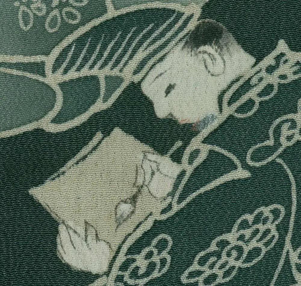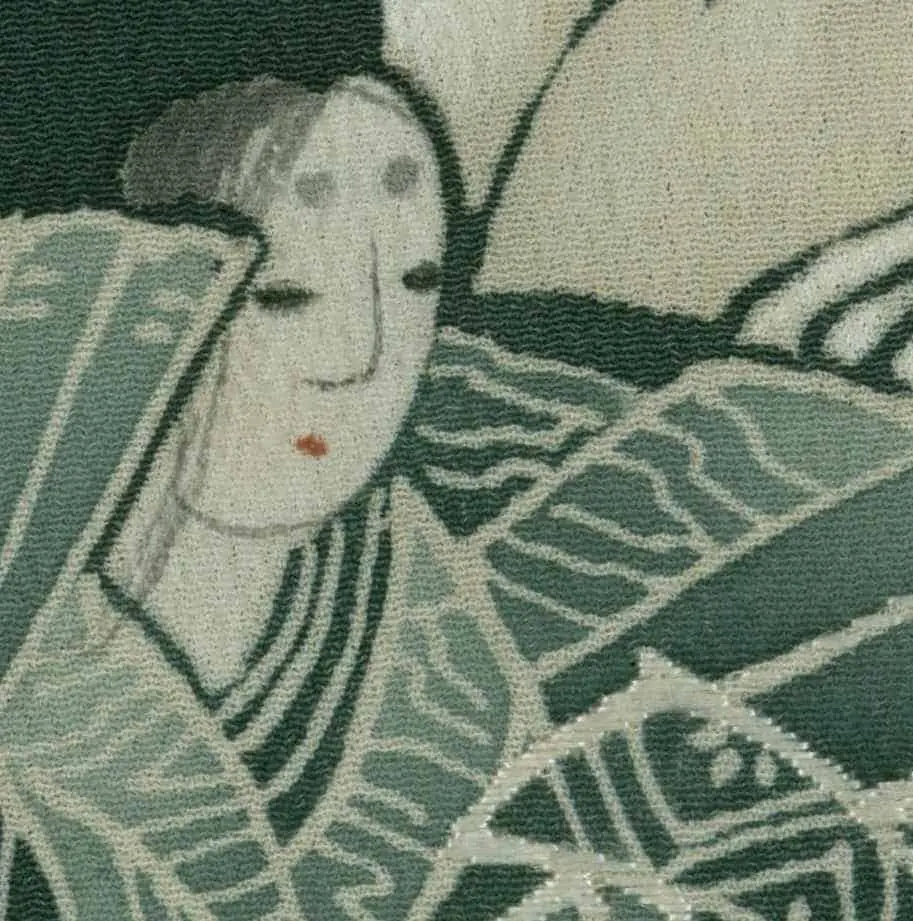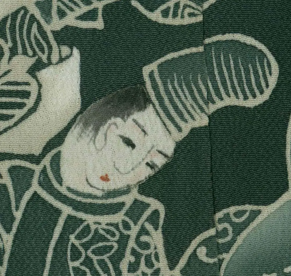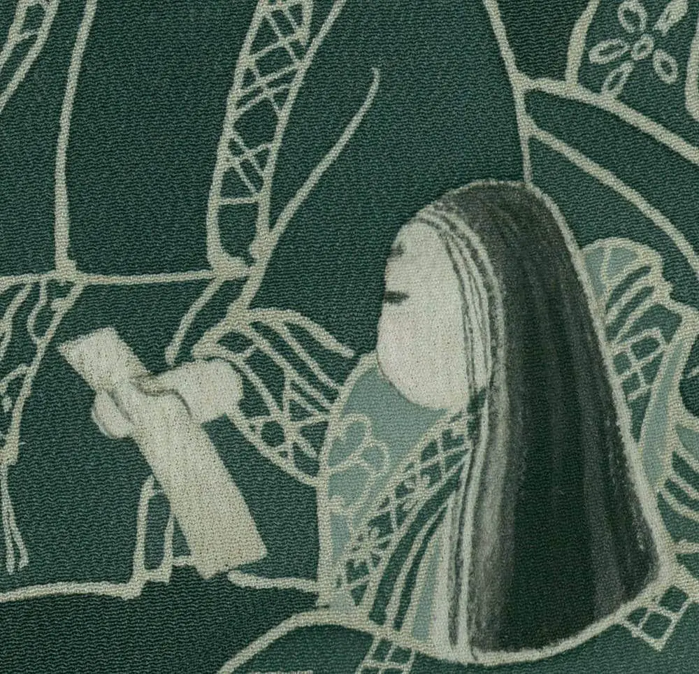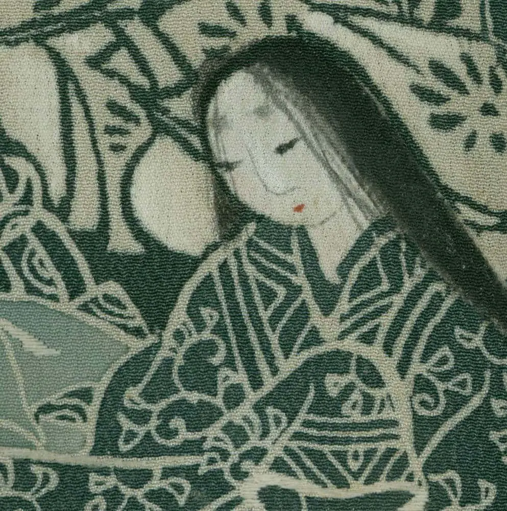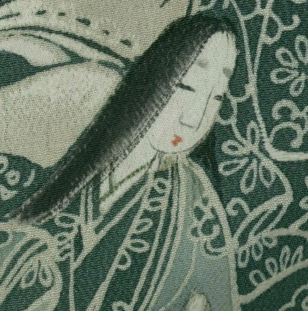 This exceptional mid-19th century chirimen silk tomesode represents a masterful example of historical narrative textile art, where yuzen painting techniques bring to life elaborate scenes from Japan's classical Heian period (794-1185). The composition features elegantly rendered court figures in traditional dress, their flowing robes and refined postures capturing the aesthetic ideals of aristocratic life that defined Japan's golden age of literature and culture. The deep forest green background creates a dramatic stage for these pale, luminous figures, while the strategic placement of the narrative scenes along the lower portion of the garment follows the formal conventions of tomesode design, appropriate for married women of high social standing.