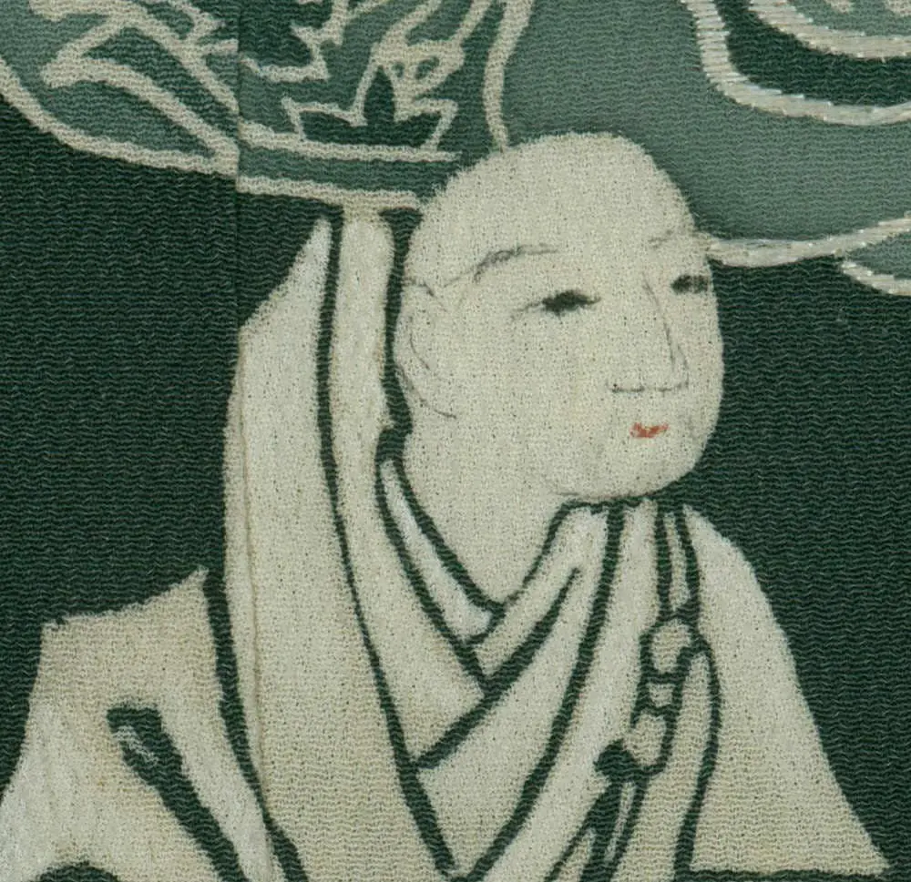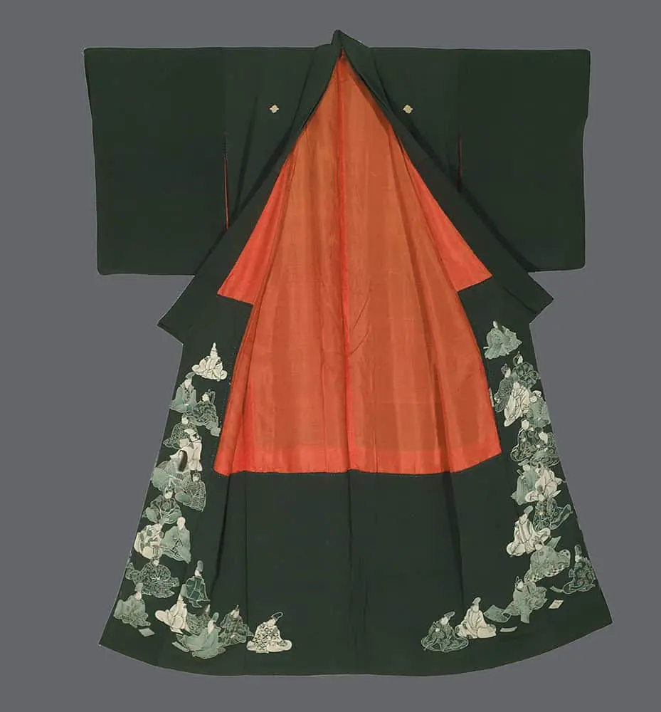 The artistic approach reflects the Edo period's romanticization of classical Japanese culture, particularly the world immortalized in works like "The Tale of Genji" and other Heian court literature. Each figure is rendered with careful attention to period-appropriate details—the layered court robes, elaborate hairstyles, and graceful gestures that conveyed social status and refined sensibility. The combination of yuzen painting with silk embroidery and freehand painted highlights demonstrates the height of Japanese textile artistry, where multiple techniques were seamlessly integrated to create depth, texture, and visual interest. This kimono embodies the Edo period's cultural sophistication and its deep reverence for classical Japanese aesthetics, serving both as wearable art and as a textile homage to the literary and artistic achievements of the Heian court.