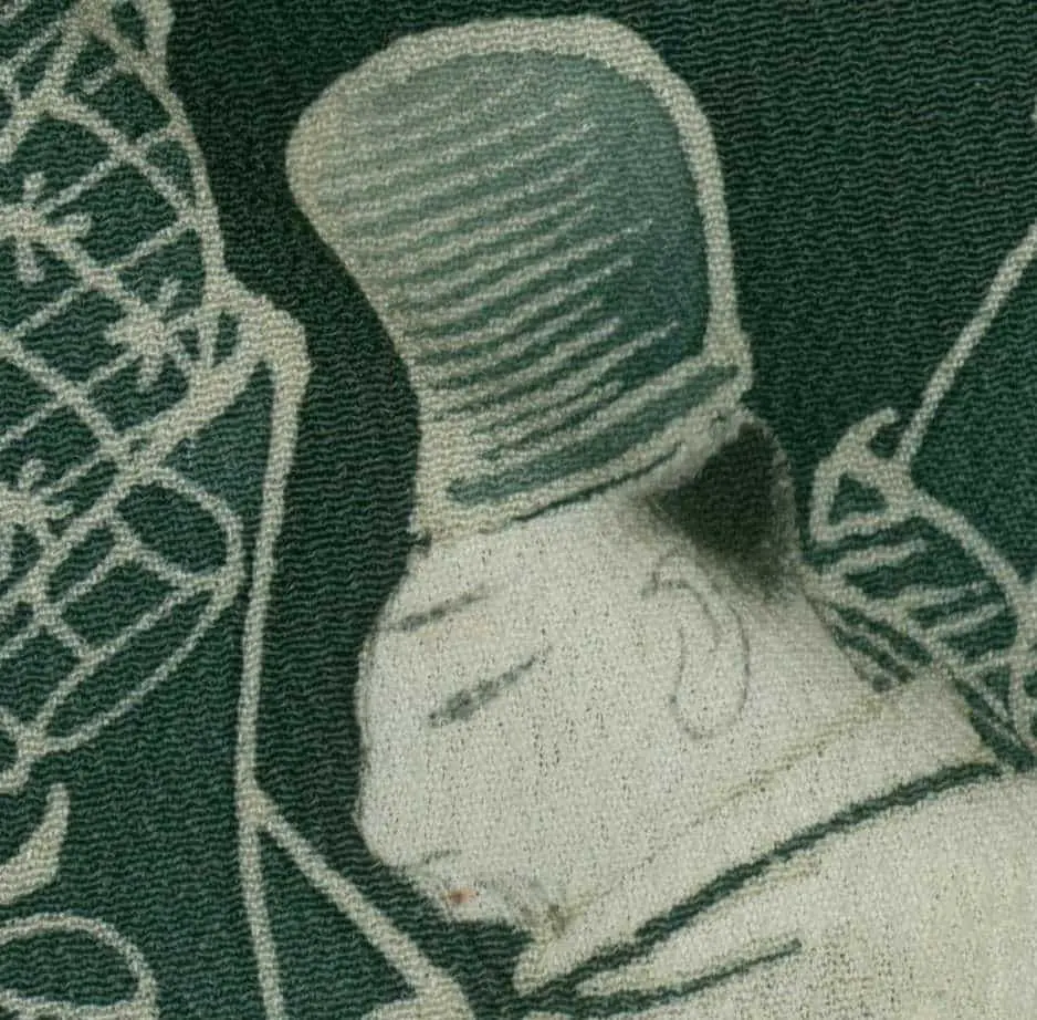 Designed for winter wear, it has two sets of cloths throughout, except for the upper doura inner lining. The orange-red doura (inner upper lining) is dyed with beni (safflower). There are five mon on this garment. Its measurements are 49 inches (124 cm) from sleeve-end to sleeve-end and 60 inches (152 cm) in height.