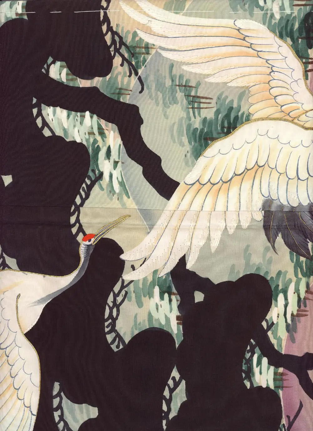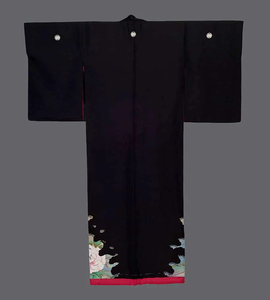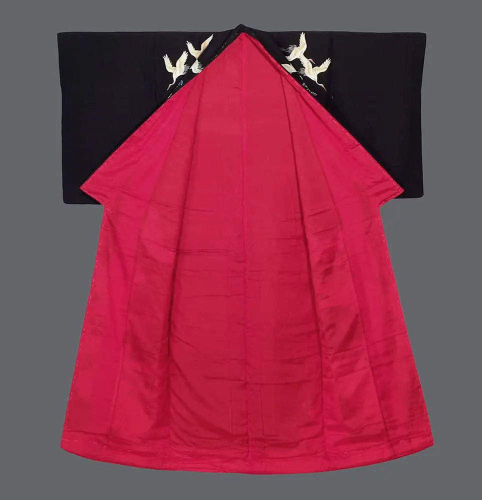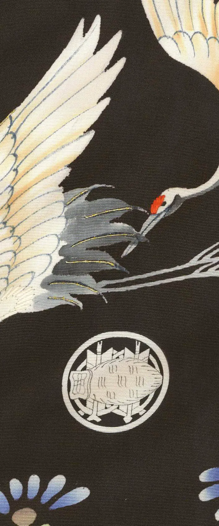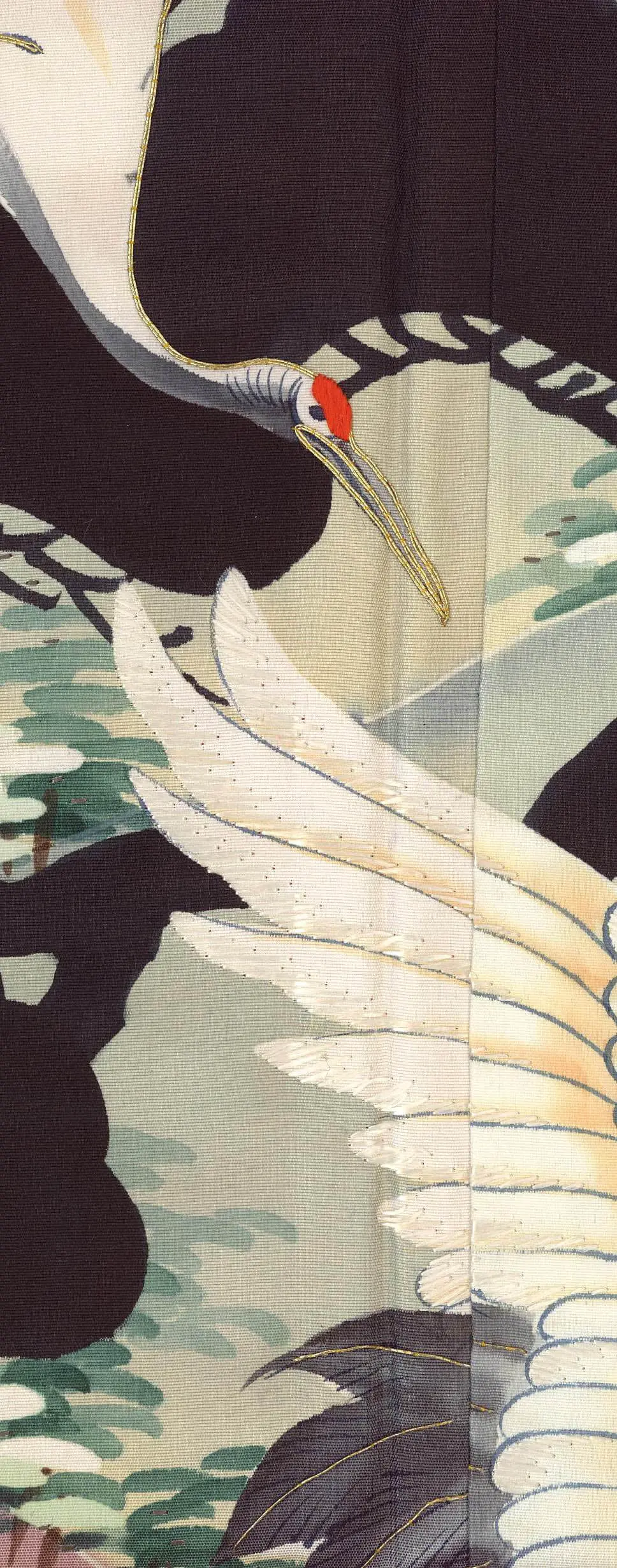 This stunning black satin silk uchikake or formal wedding robe is a masterpiece of auspicious symbolism and meticulous craftsmanship. Its design flows dramatically across the dark silk, featuring flocks of graceful cranes, which are revered symbols of longevity, good fortune, and marital fidelity. Lavish peonies, known as the "King of Flowers," bloom at the hem, signifying wealth and honor, while noble chrysanthemums are scattered throughout, adding wishes for longevity and rejuvenation. This rich visual narrative was achieved through a combination of highly skilled techniques; Yūzen resist-painting creates the delicate, graduated colors of the flowers, while intricate satin-stitch and shimmering metallic-thread couching embroidery give the motifs texture and luxurious depth. The atmospheric quality of the clouds and misty landscape is rendered with sumi-e brush-painting, creating a work that is at once a garment and a painting, reflecting a refined naturalism that was highly prized during this transitional artistic period.