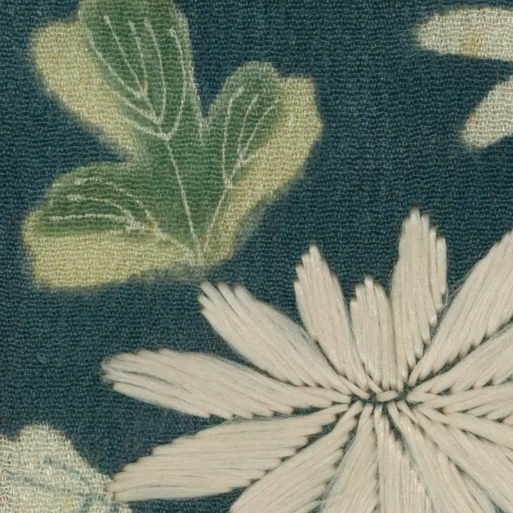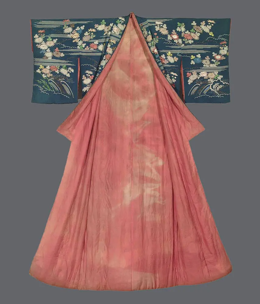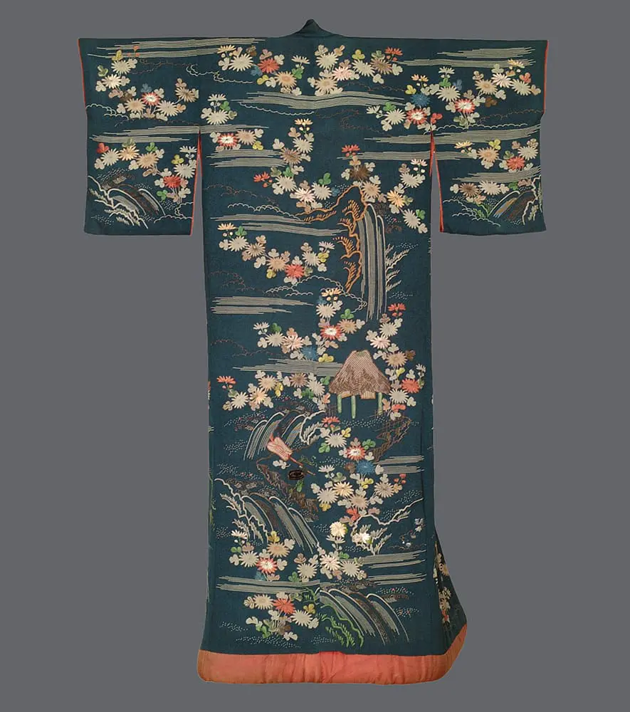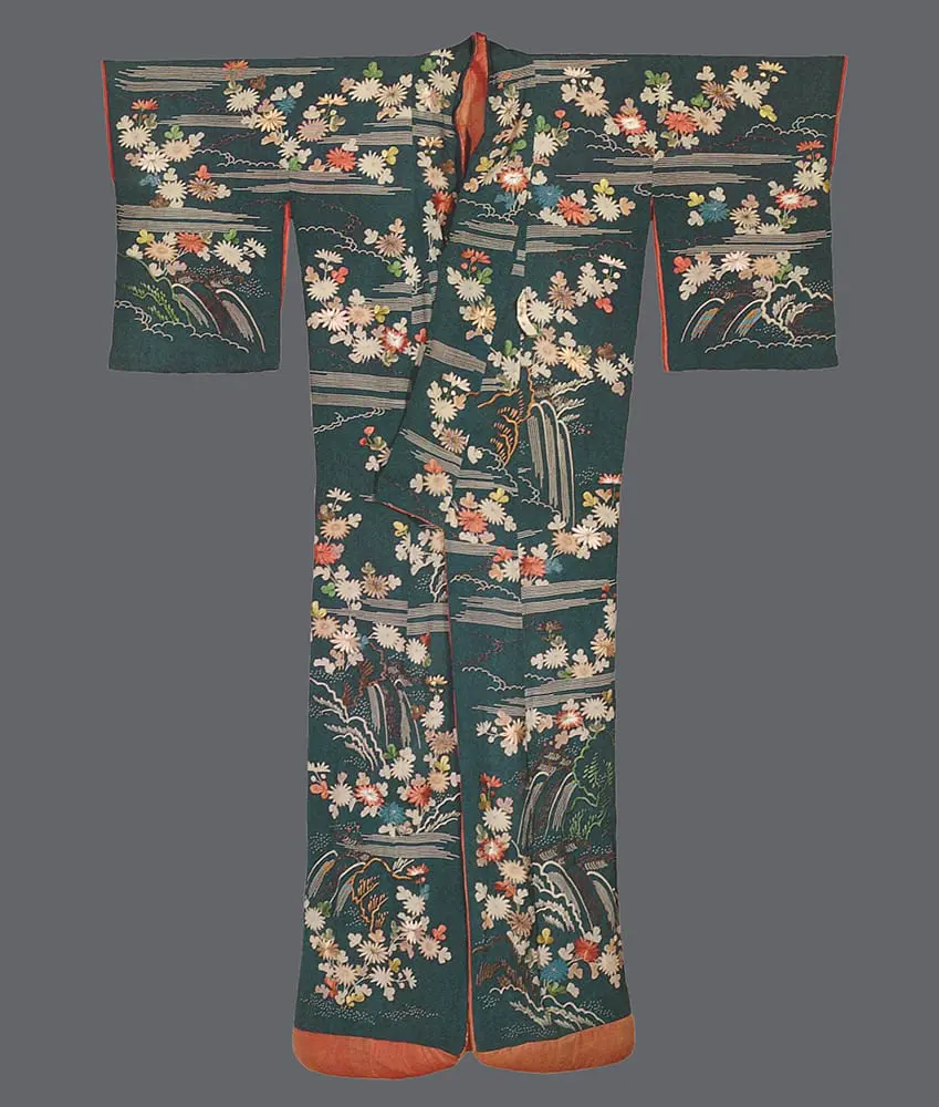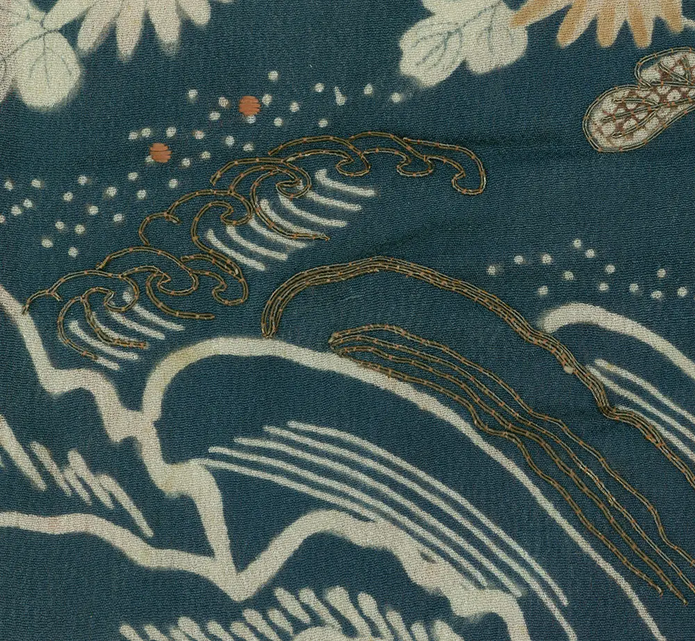 This chirimen silk uchikake embodies the sophisticated aesthetic sensibilities of Japan's samurai elite. The garment's deep teal ground serves as a luxurious canvas for an intricate narrative landscape that combines multiple decorative techniques - embroidery, yuzen painting, and couching - to create a richly textured surface that seems to shimmer with life. The composition skillfully balances densely embroidered chrysanthemums and other seasonal flowers with flowing waterfalls rendered in white silk threads, creating a dynamic interplay between botanical abundance and the power of rushing water.