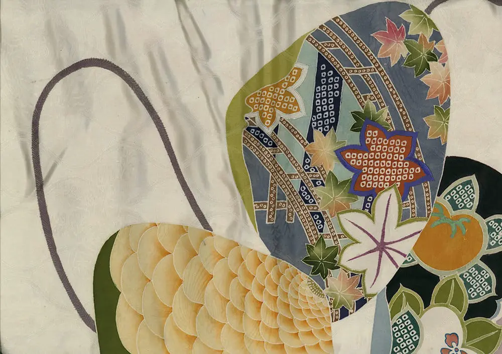 The detailed views reveal the extraordinary technical virtuosity involved in this garment's creation, where multiple textile techniques—yuzen painting, embroidery, and applied work—combine to create surfaces of almost sculptural complexity. The patchwork-like shells with their geometric patterns and floral motifs demonstrate a fascination with layered visual textures that create depth through overlapping transparent and opaque elements. This approach to surface treatment anticipates developments in collage and mixed-media arts while remaining firmly grounded in the symbolic vocabulary of Japanese court culture, where each decorative element carries specific meanings related to fidelity, longevity, and marital harmony appropriate to this wedding garment's ceremonial function.