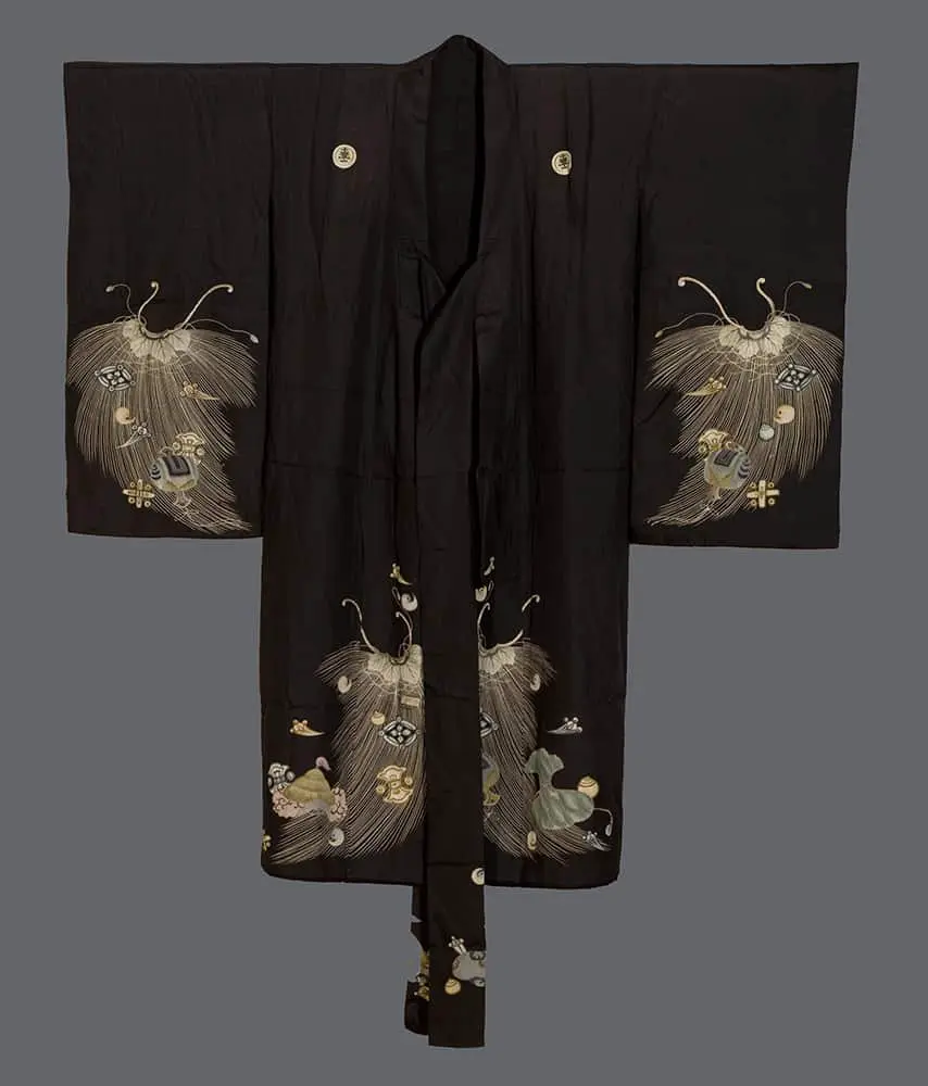 This ceremonial youth kimono employs the sophisticated metaphor of the "cape of invisibility" to create an ingenious design solution.. Set against a lustrous black satin silk ground, the composition features multiple groupings of the Shichiho (Seven Treasures) - legendary auspicious objects that include the wish-fulfilling jewel, sacred scrolls, rhinoceros horn cups, clove weights, and other talismanic items believed to bestow protection and prosperity upon the wearer. The yuzen-painting technique achieves remarkable precision in rendering each treasure with distinctive colors and intricate surface patterns, while the light padding adds dimensional quality that enhances the garment's ceremonial gravitas.
