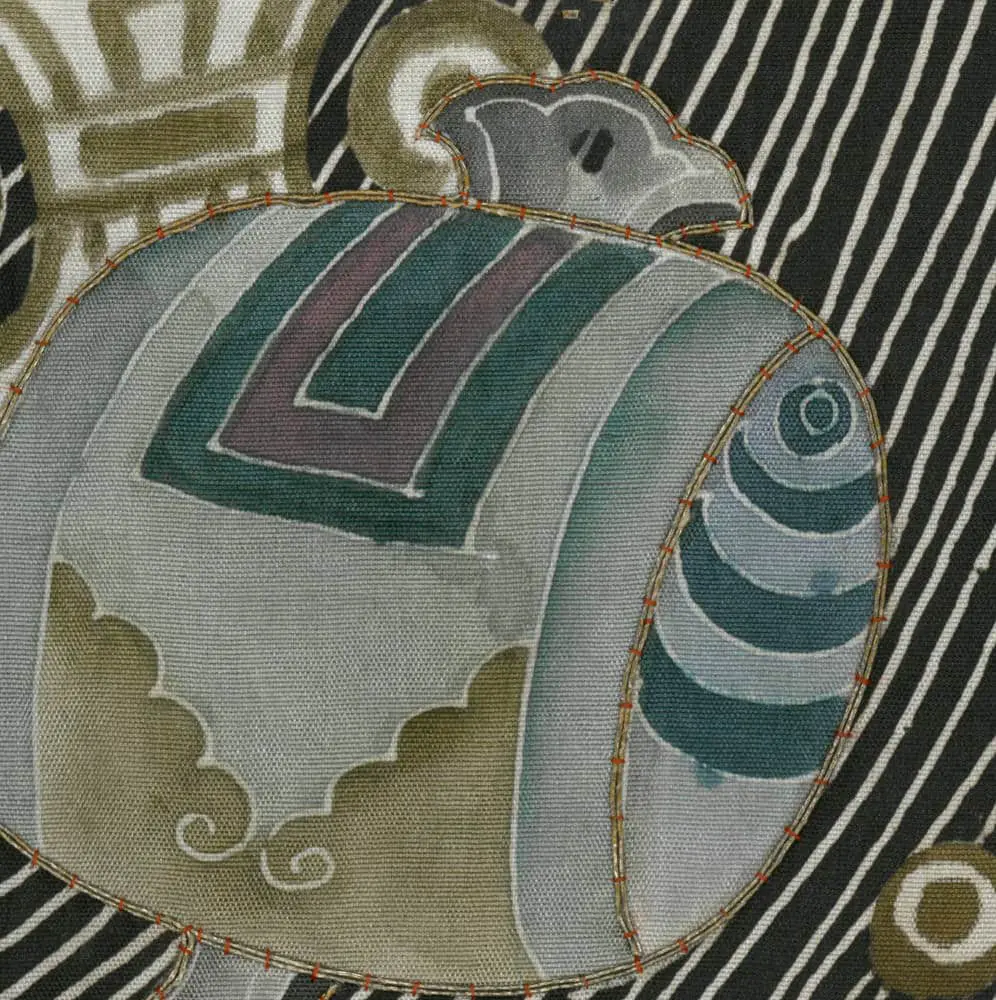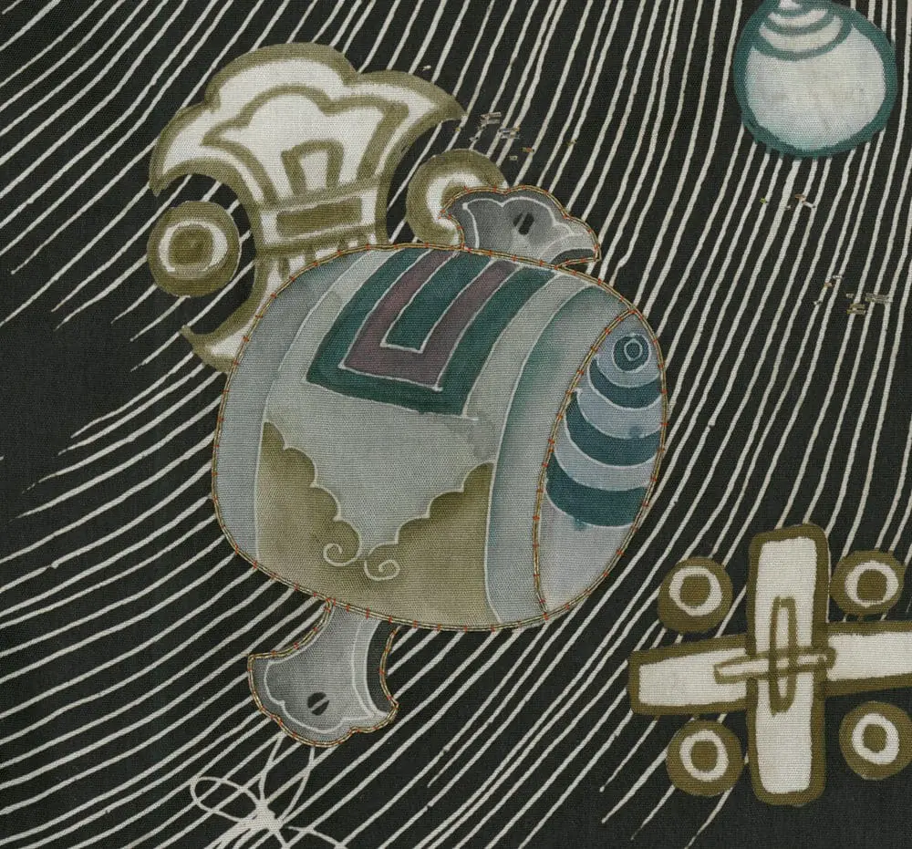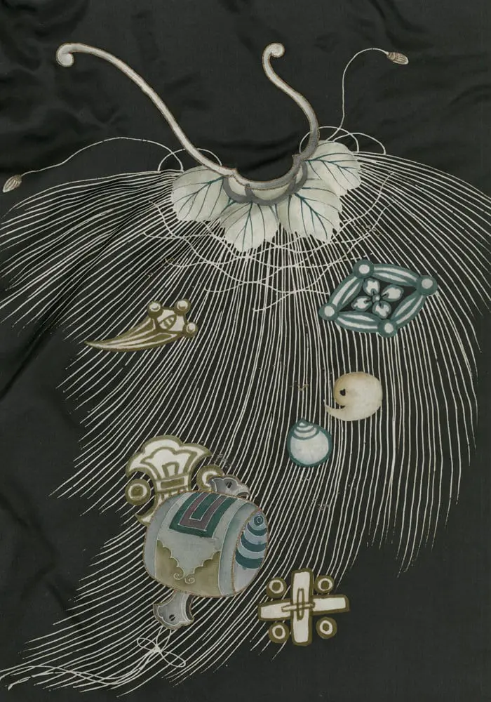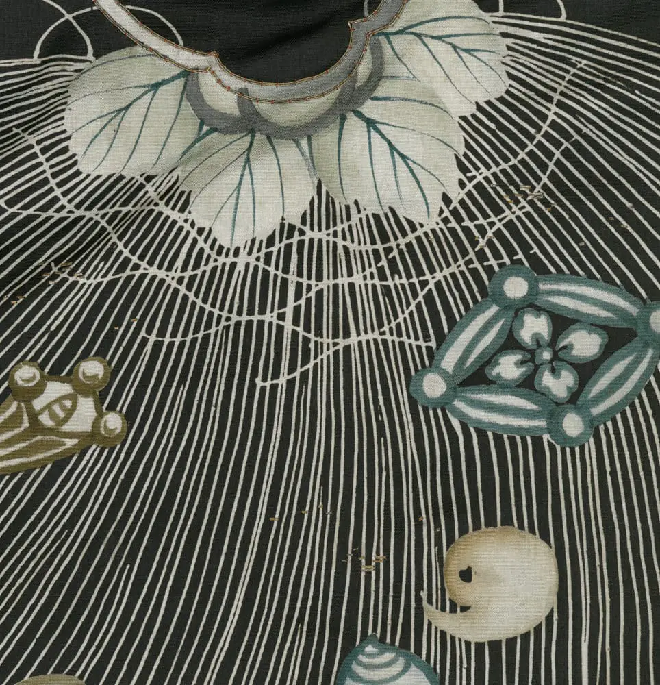 The artistic genius of this piece lies in the designer's use of the cape of invisibility motif as both literal treasure and compositional device - the flowing, linear cape forms create dynamic visual connections between scattered treasure groupings, transforming what could have been a static arrangement into a unified, rhythmic composition that flows gracefully around the kimono's form. This approach reflects the sophisticated understanding of negative space and visual flow characteristic of the Rinpa school, while the symbolic program speaks to Confucian ideals of virtue and protection appropriate for a young person of high social standing. The overall effect creates a sense of magical protection quite literally woven into the fabric, embodying the Japanese aesthetic principle of functional beauty where artistry serves both decorative and spiritual purposes.
